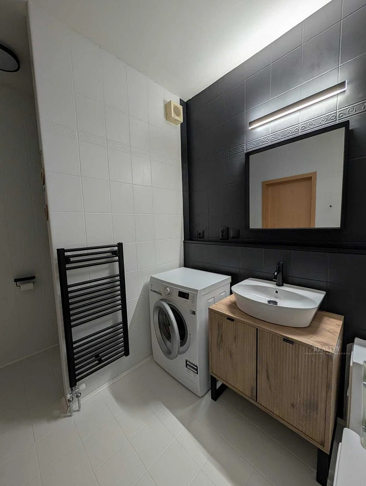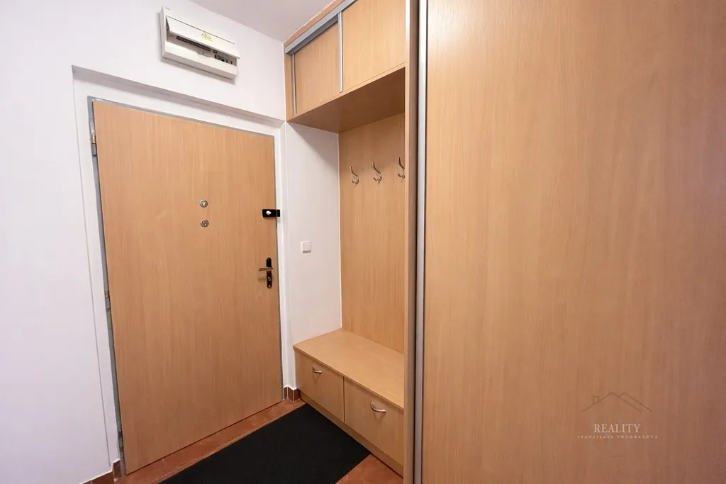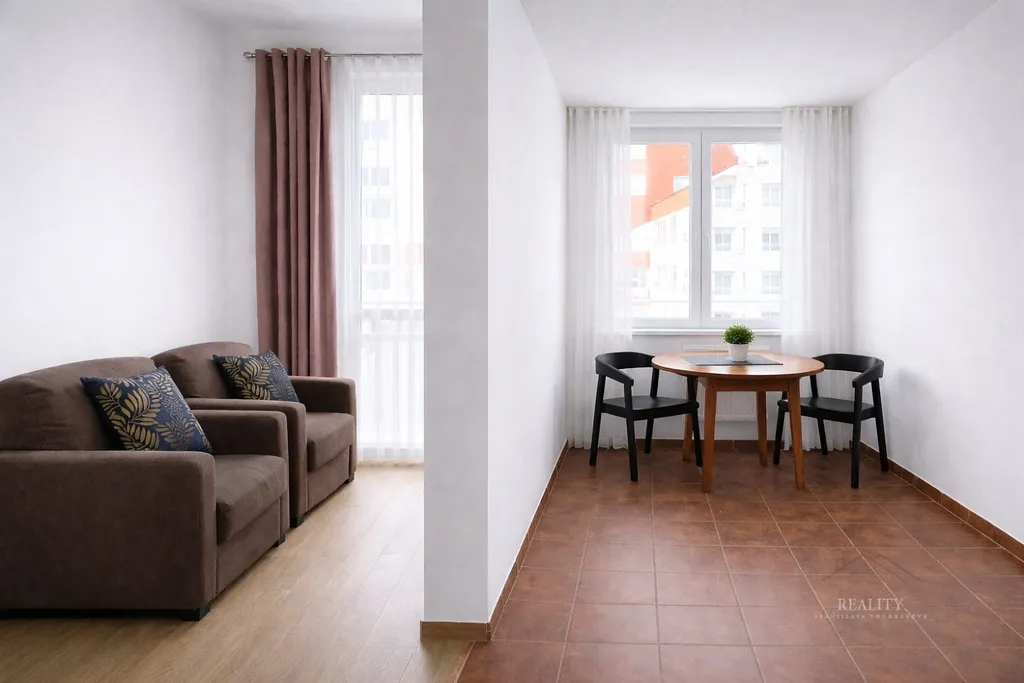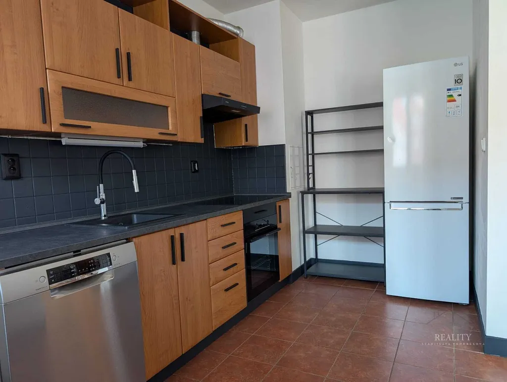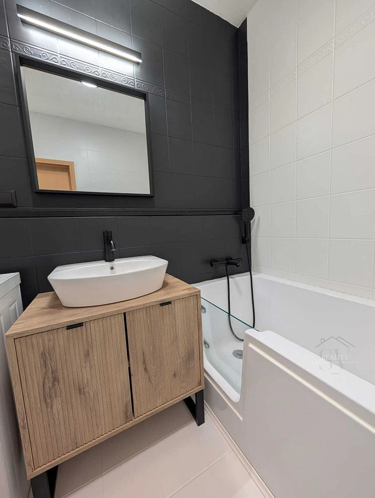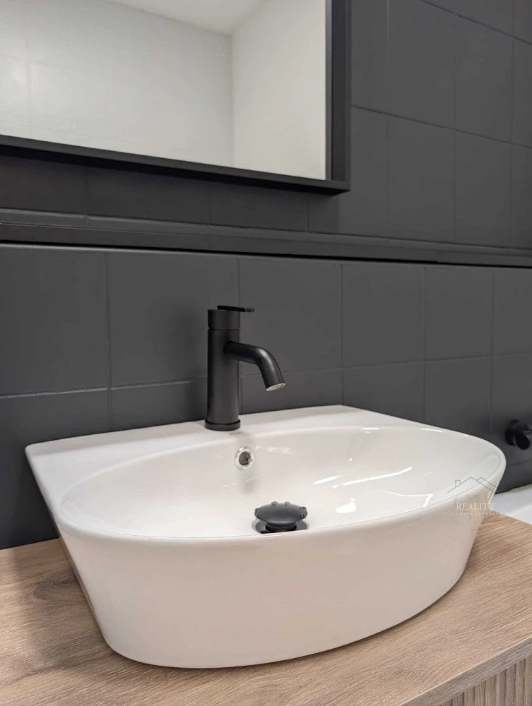Byt je po renovaci a působí velmi čistým, moderním a nadčasovým dojmem. Interiér kombinuje přírodní dekory dřeva, antracitové prvky a neutrální tóny, které vytvářejí útulnou, ale elegantní atmosféru.