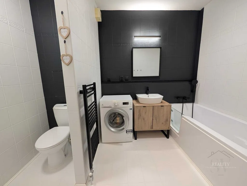 Koupelna s vanou a WC: pračka, koupelnová skříňka, zrcadlo