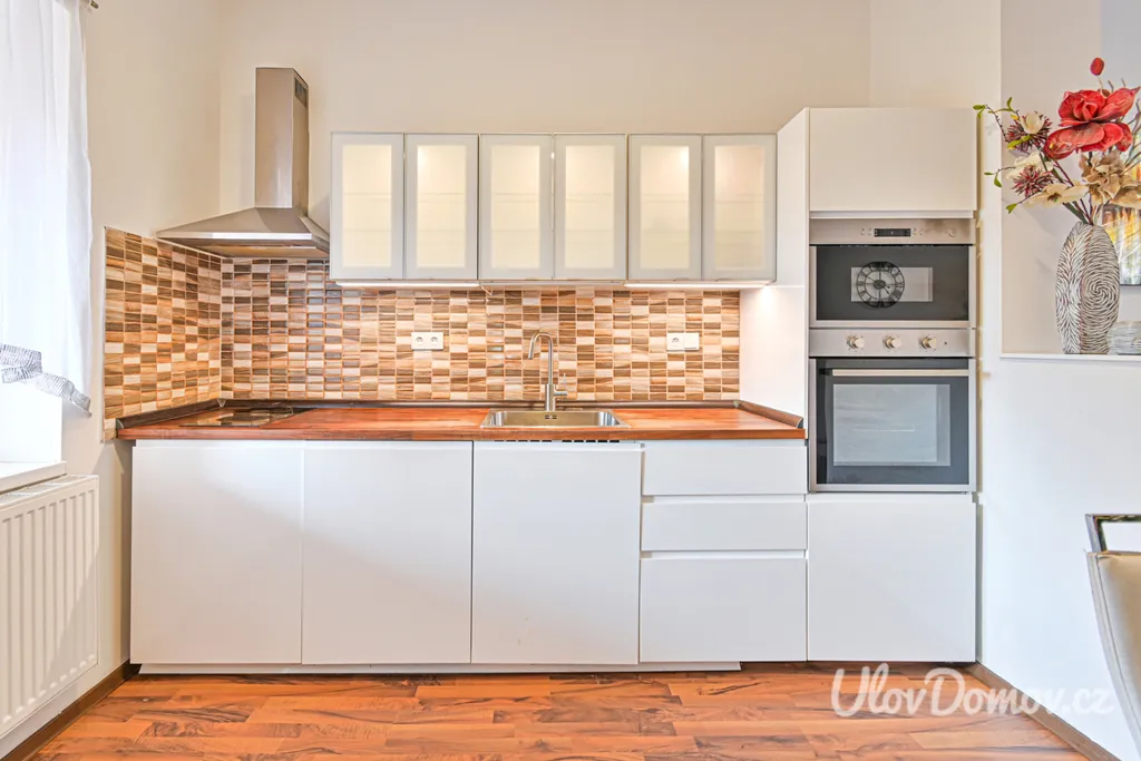 V kuchyni se nachází kuchyňská linka vybavena sklokeramickou deskou, troubou, mikrovlnou troubou, myčkou, lednicí a digestoří. Dále se zde nachází jídelní stůl se židlemi. Obývací pokoj je od kuchyně oddělen barovým pultem a dá se popřípadě přepažit a úplně oddělit od obývacího pokoje. Je zde tedy možnost byt předělat na 3+1. V koupelně je sprchový kout, umyvadlo se zrcadlem, Wc.