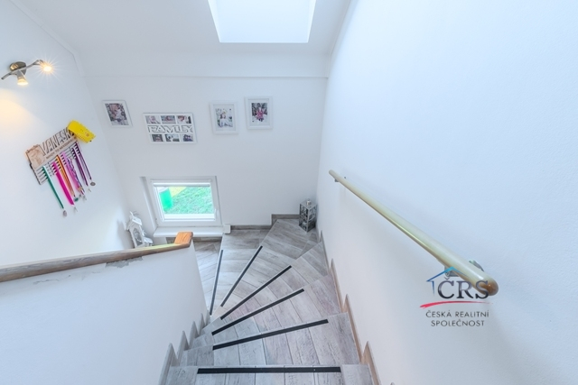 V patře jsou tři útulné ložnice a koupelna s vanou. Dům je světlý, funkční a působí velmi příjemnou, domáckou atmosférou. Vytápění zajišťuje elektrokotel doplněný krbovou vložkou, TUV v boileru. Dům je energeticky úsporný (PENB – třída B), zatepleno 15 cm. IS. elektrika, vlastní vrtaná studna, jímka 13 m3.