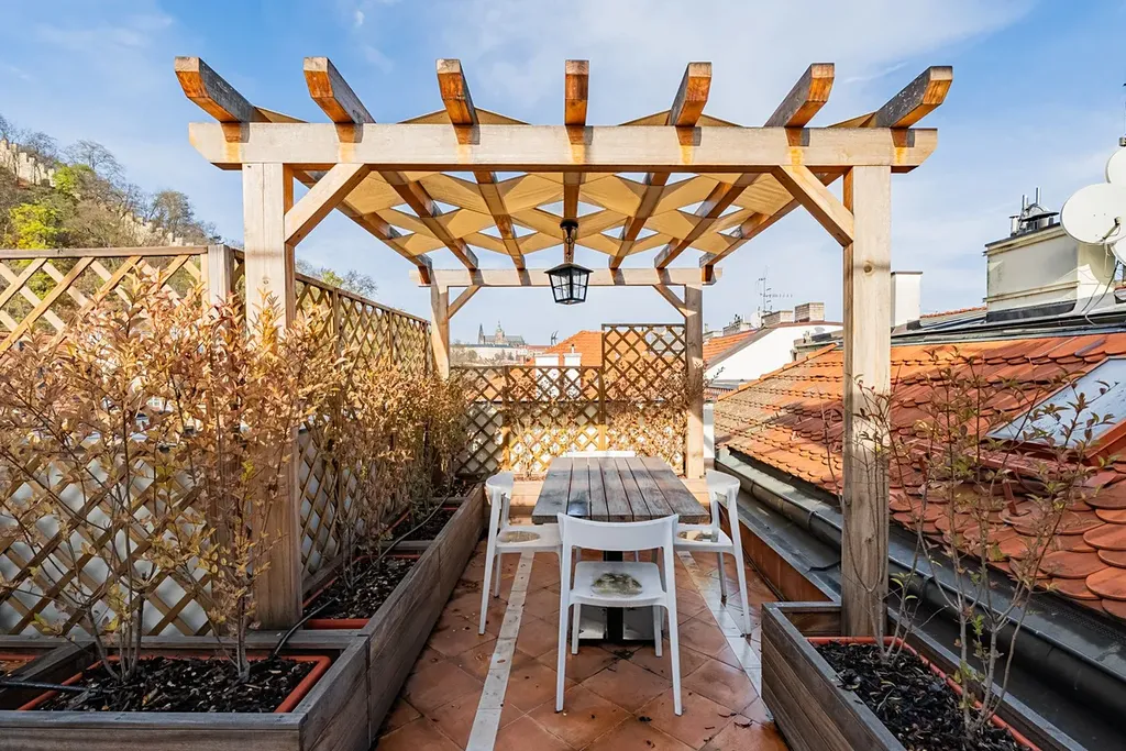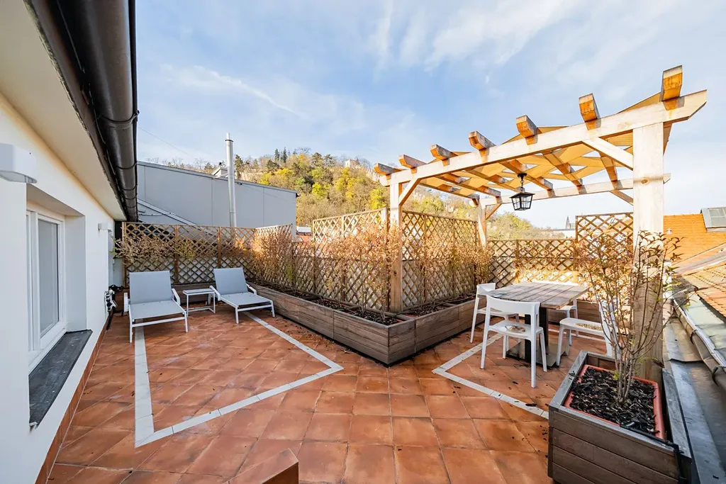 Luxusní podkrovní duplex 5+1 (3 ložnice, 3 koupelny), o celkové rozloze 265 m2, je situován v 5. a 6. patře zrekonstruované neorenesanční rezidenční budovy s výtahem a recepcí v prestižní lokalitě Malá Strana na Praze 5, v ulici Újezd.