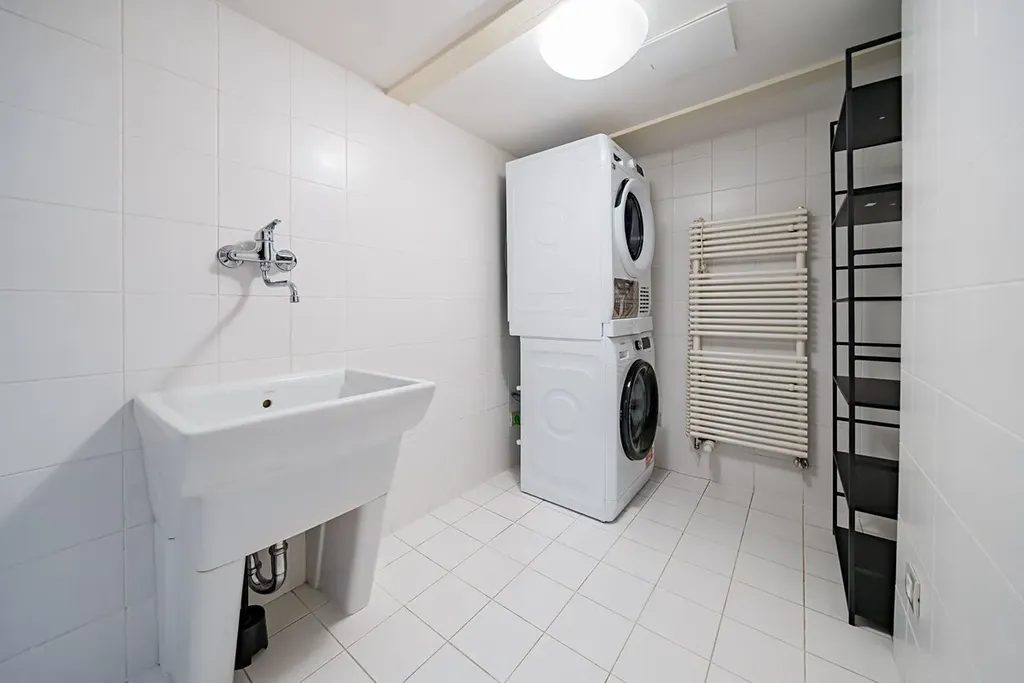 Interiér bytu je nezařízený. Byt se sestává ze dvou pater. Hlavní patro dispozičně nabízí vstupní předsíň, plně zařízenou kuchyň s vestavěnými spotřebiči (sklokeramická deska, trouba, lednice, mrazák, myčka nádobí a mikrovlnná trouba), ložnici se vstupem na balkon s vlastní šatnou a ensuite koupelnou (sprchový kout, vana, toaleta, bidet), 2 ložnice také se vstupem na balkon, koupelnu (vana, toaleta, bidet), šatnu a komoru. V patře se nachází galerie, kterou lze využít jako další ložnici nebo společenskou místnost, koupelna (sprchový kout, toaleta, bidet), dále prádelna a terasa (35 m2), která nabízí krásný výhled na Pražský hrad a Petřín. Možnost pronájmu garážového parkovacího stání v zakladači za měsíční poplatek 3 900 Kč + DPH. Součástí vybavení bytu je pračka, sušička a klimatizace. K bytu náleží sklep.