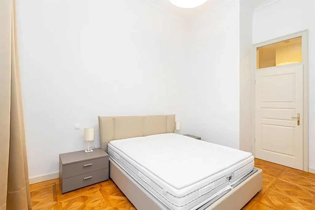 Reprezentativní zařízený byt 3+1 ( 2 ložnice, 2 koupelny), o velikosti 93 m2, je situovaný ve 2.NP rezidenční budovy s výtahem, která je kompletně zrekonstruovaná. Zachovaly se štukové stropy, dřevěná obložení a další prvky.