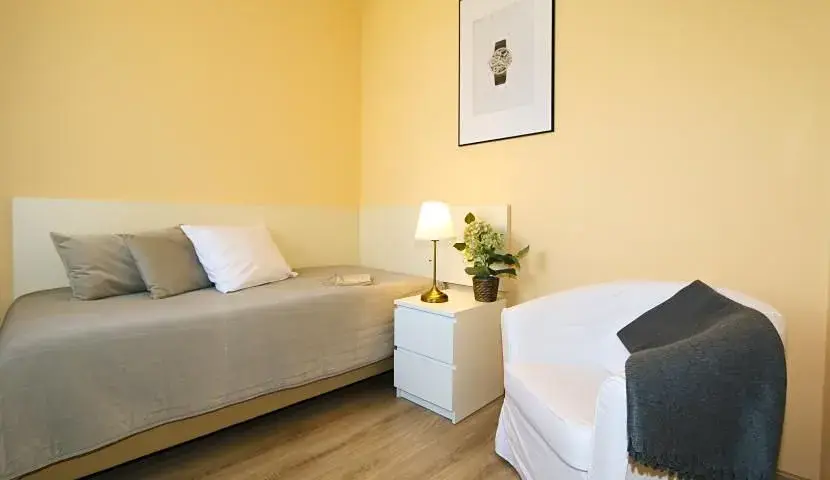 Interiér bytu je zařízený a dispozice nabízí vstupní chodbu, obývací pokoj s plně vybaveným kuchyňským koutem, hlavní ložnici s vestavěnou šatní skříní, druhou menší ložnici a moderní koupelnu. Další vybavení bytu: trouba, sporák/trouba, mikrovlnná trouba, varná konvice, kávovar, toustovač, TV, satelitní přijímač, WiFi.