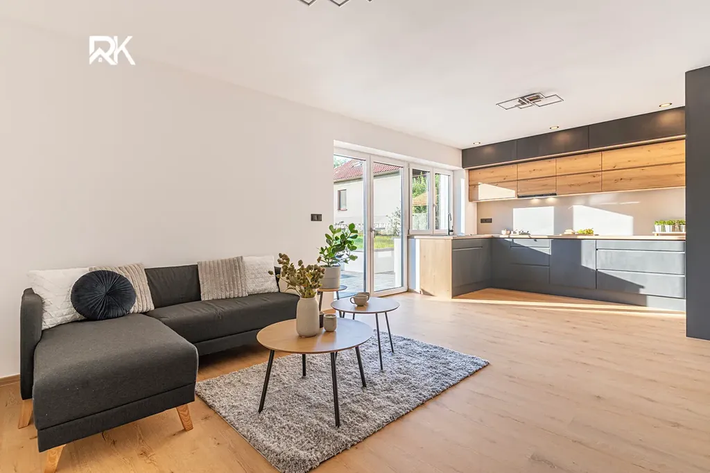 Dvě koupelny s WC, prostorný obývací pokoj s výstupem na terasu, tři ložnice a moderní kuchyňská linka AEG. Vše nové, včetně rozvodů elektřiny, vody i kanalizace.