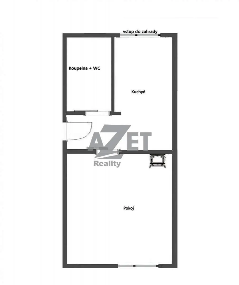 Byt 1+1, pokoj, kuchyň s vchodem na zahradu, koupelna s WC, zádveří.