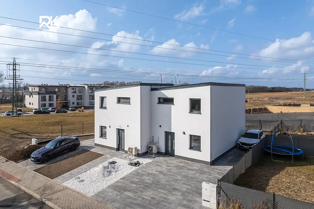 Zahrada se zpevněnými plochami z velkoformátové dlažby a venkovním nemrznoucím kohoutem. K domu náleží dvě vlastní parkovací stání přímo před vstupem.