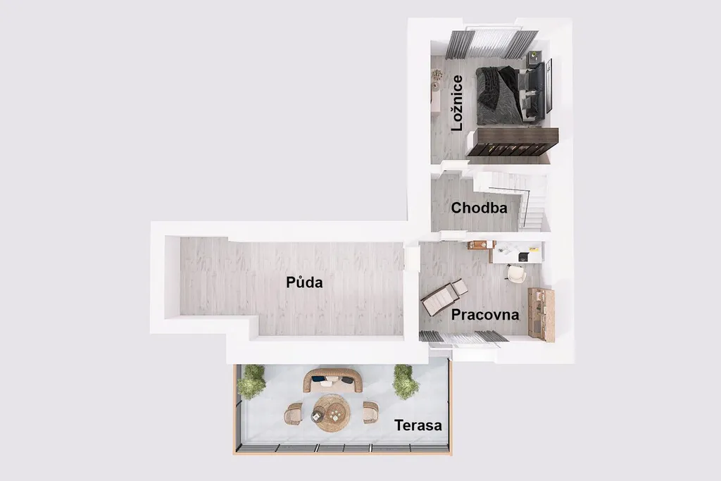 Dominantou přízemí je velkorysý obytný prostor s kuchyní a jídelnou o výměře 51 m2, na který navazuje zimní zahrada a venkovní terasa. V přízemí se dále nachází pokoj pro hosty, koupelna a technická místnost. V patře je umístěna ložnice, šatna a dětský pokoj s přímým vstupem na prostornou terasu. Dispozice domu je praktická a umožňuje pohodlné rodinné bydlení i případné úpravy do budoucna.