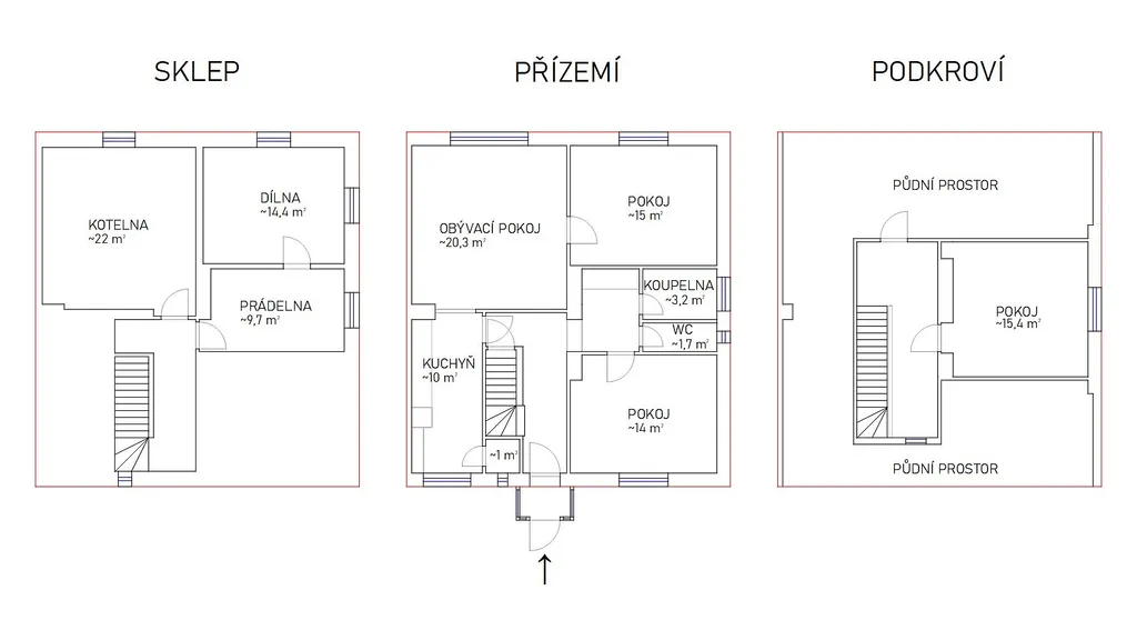 Dům je téměř celý podsklepený, přízemní s obytným podkrovím pod sedlovou střechou. V přízemí se nachází vstupní chodba, samostatný pokoj, koupelna, WC, spíž a vstup do podkroví i sklepních prostor. Přes kuchyni se vstupuje do prostorného obývacího pokoje s navazující ložnicí. Podkroví nabízí již jeden hotový pokoj, zároveň však velkorysou půdu vhodnou pro další vestavbu.