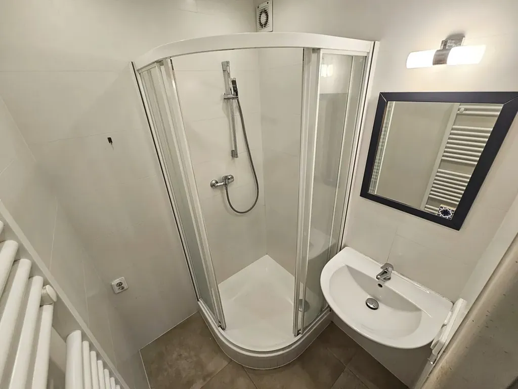 V bytě se nachází prostorný obývací pokoj s kuchyňským koutem (25,5 m2) + ložnice (12,5 m2) + koupelna se sprchovým koutem (2,2 m2) + samostatné WC (1 m2) + komora s místem a připojením pro pračku (0,9 m2) + chodba (6 m2) + k bytu náleží sklep v suterénu (3 m2) + uzamykatelná a zasklená pavlač (pro dva byty, 6 m2).