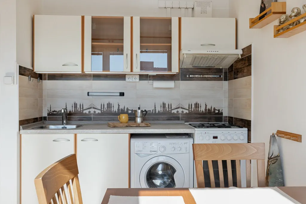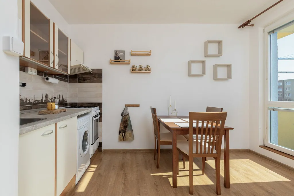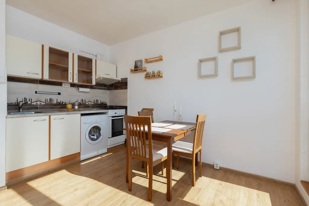 Kuchyň je tvořena hlavní částí linky s vestavěnou pračkou, na míru dělanou úložnou částí s lednicí i mikrovlnkou a vstupem na balkón. Celkově nabízí dostatek úložného prostoru i prostoru pro plnohodnotný jídelní stůl se židlemi.