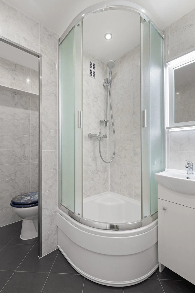 Útulnost bytu dotváří ve světlých tónech laděná koupelna se sprchovým koutem, umyvadlovou skříňkou a ve stejných tónech řešená toaleta se vstupem přes koupelnu.