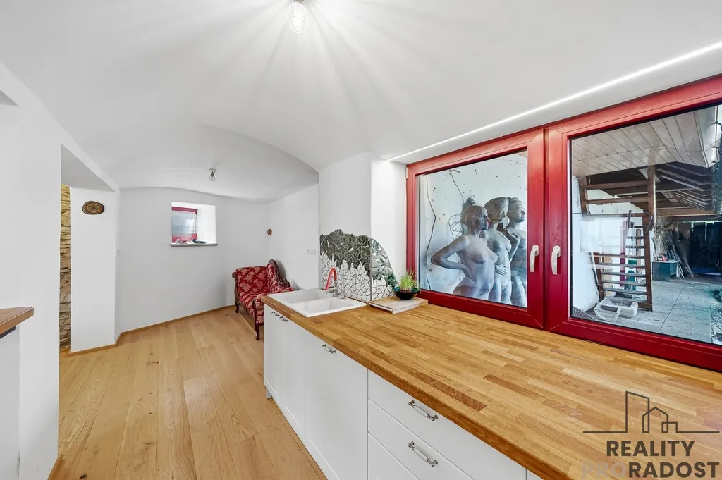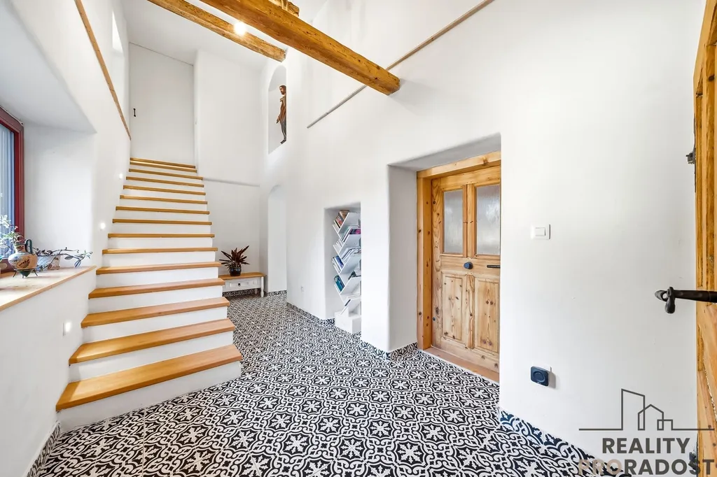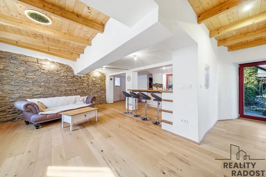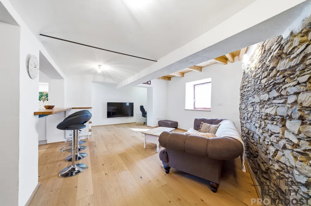 Majitelé domu, díky velmi vkusné a zdařilé rekonstrukci, vdechli tomuto domu jedinečnou atmosféru. Za vstupní chodbou se nachází hala se schodištěm, na kterou navazuje prostorný obývací pokoj s kuchyňským koutem a s výhledem a se vstupem do dvora. Obývací pokoj propojený s kuchyní tvoří srdce domu, je zde nová kuchyňská linka včetně spotřebičů. V přízemí domu je také útulná ložnice, nově vybudovaná zajímavá koupelna se sprchovým koutem, vanou a umyvadlem, dále je v přízemí samostatné WC. V patře jsou dvě prostorné ložnice. Dům je rozdělen průjezdem, přes průjezd je možné se dostat do druhé části domu, kde se nachází pokoj v přízemí, koupelna s vanou a WC. Tuto část domu je možné využívat samostatně k pronájmu či dvougeneračnímu bydlení nebo je možné ji využívat spolu s druhou rekonstruovanou částí domu. Obě části domu jsou propojené vnitřním schodištěm a dispozici jednotlivých bytů je možné jednoduše změnit.