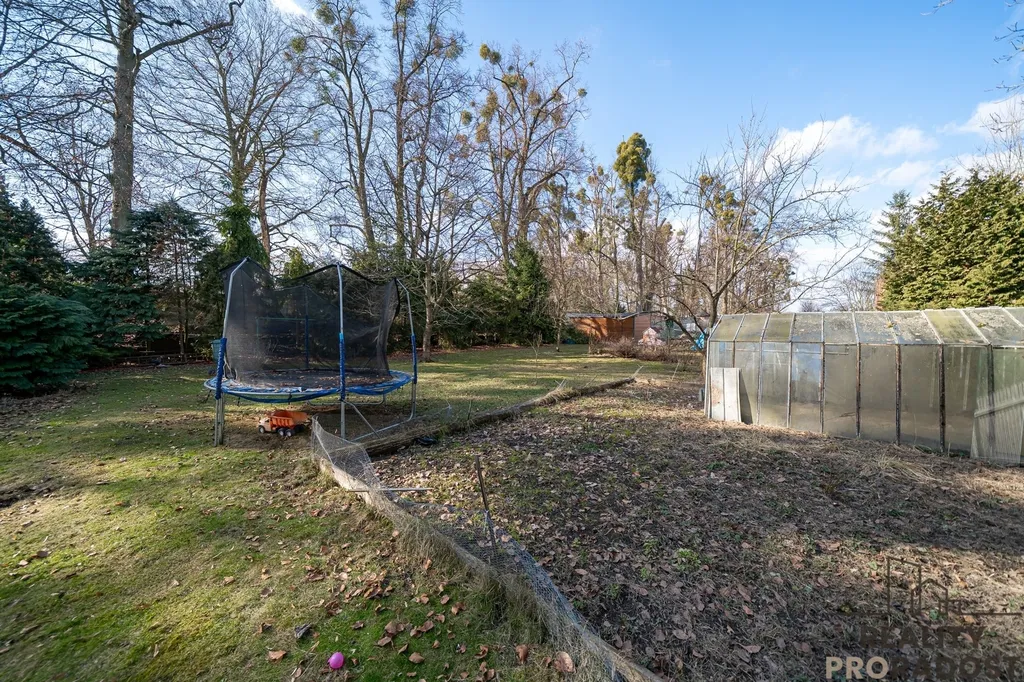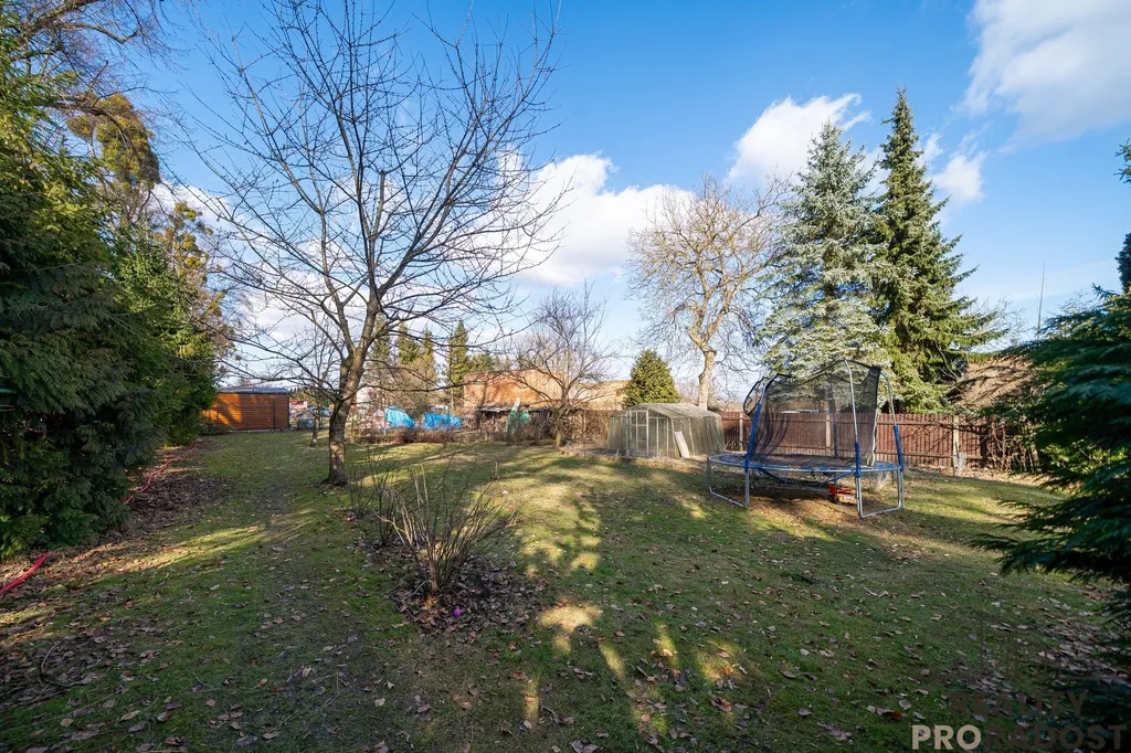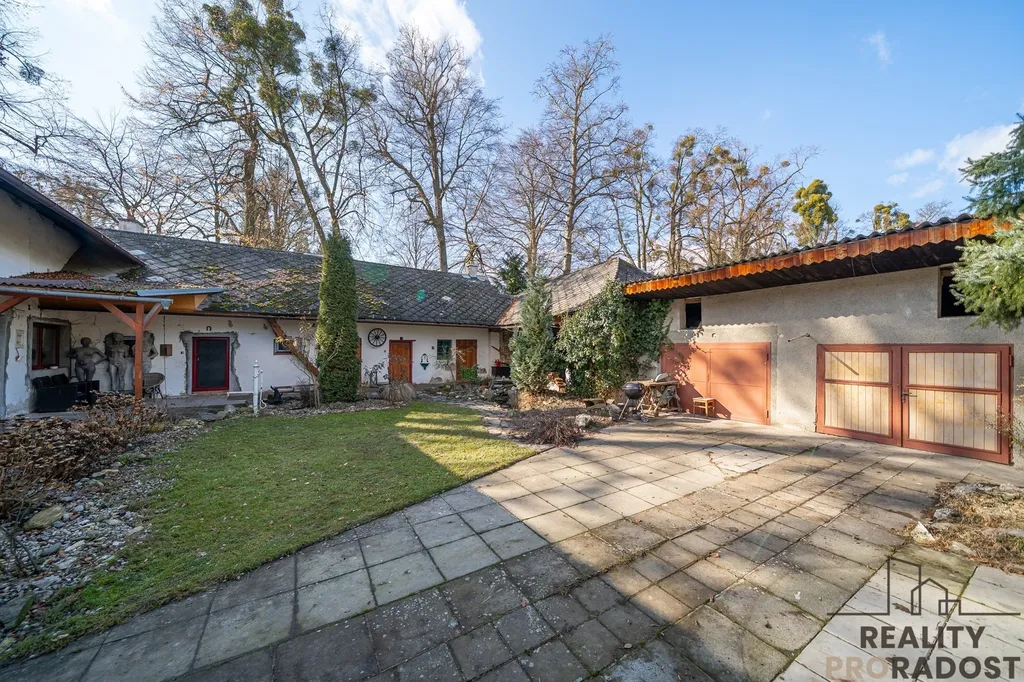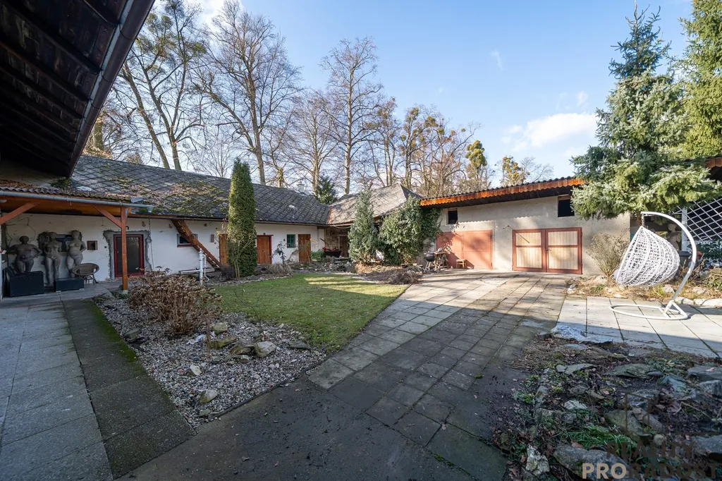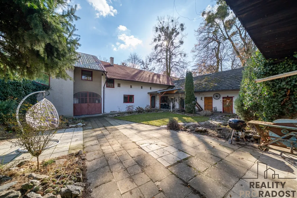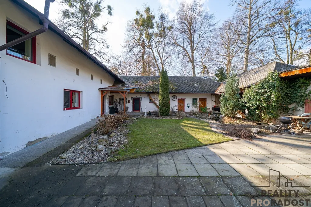 Součástí domu je slunný, uzavřený dvůr s posezením, zahradním jezírkem a okrasnou zahradou. Na dvůr navazuje menší stodola s průchodem do prostorné zahrady. Zahrada je oplocená, je zde skleník a vzrostlé stromy. Na dvoře jsou dvě garáže, udírna, kůlna a technické místnosti s dostatečným úložným prostorem. Na pozemku je vlastní studna a velká retenční nádrž, která zajišťuje dostatek užitkové vody.