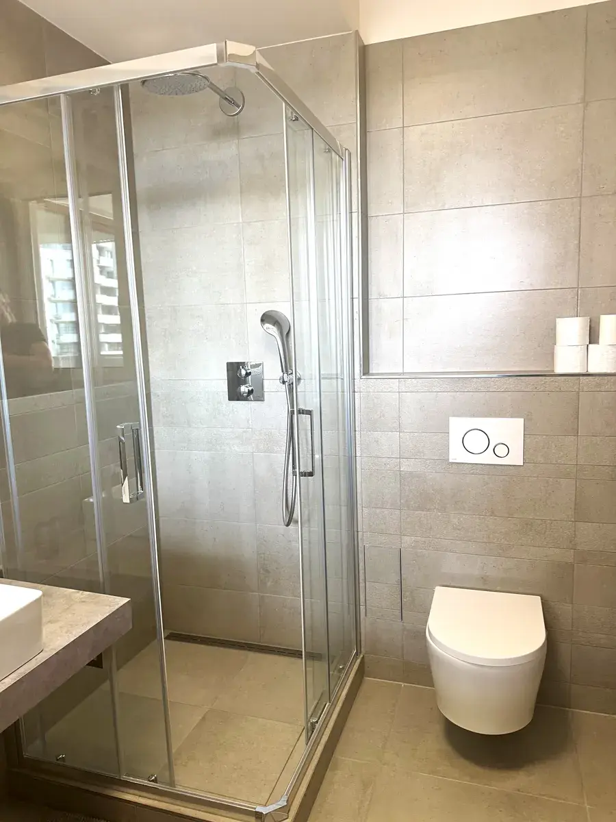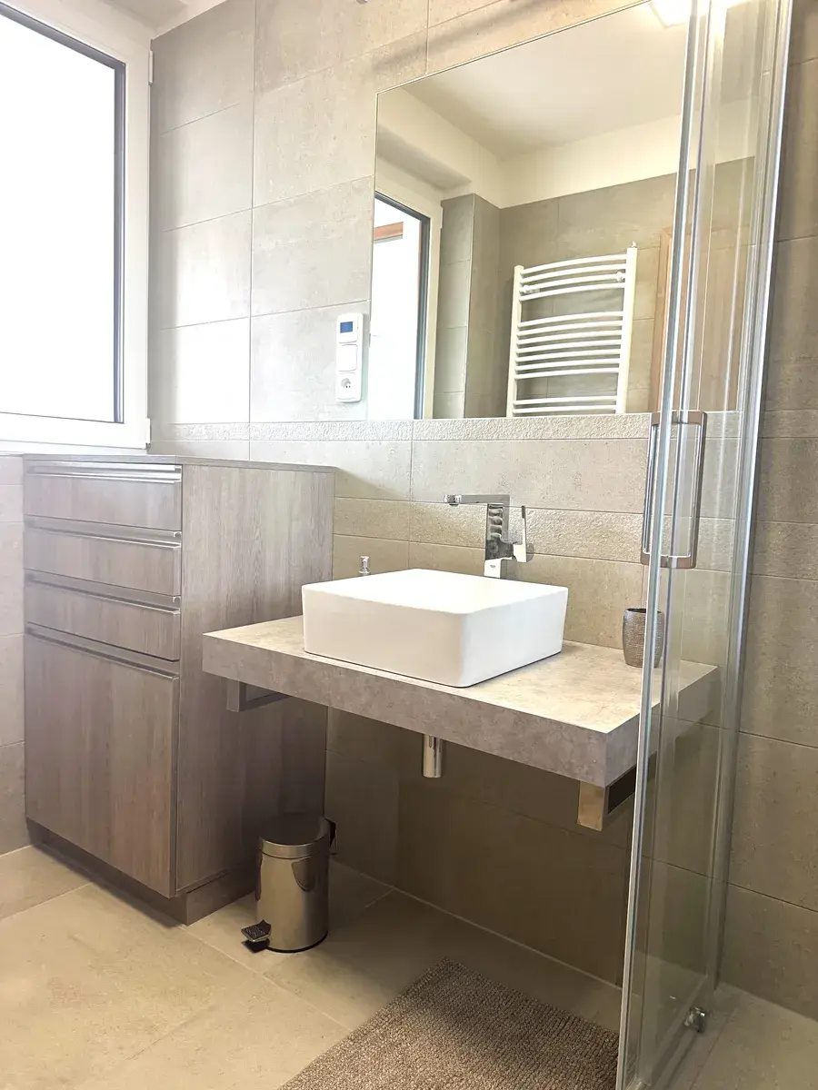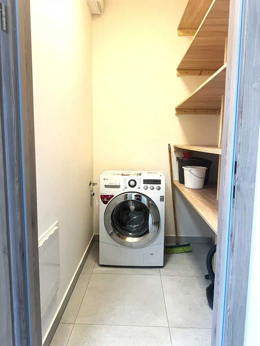 Hlavní ložnice disponuje samostatnou šatnou, vstupem na druhou terasu a koupelnou se sprchovým koutem a toaletou. V této koupelně je výhodou okno. Ve druhé ložnici je vestavěná skříň. Do druhé koupelny je vstup z předsíně a koupelna je s vanou. V obou koupelnách je podlahové topení. Dále samostatná toaleta a praktická technická místnost s pračkou. Okna ve všech pokojích mají venkovní žaluzie na dálkové ovládání. Byt se pronajímá částečně zařízený tak, jak je zachyceno na fotografiích.