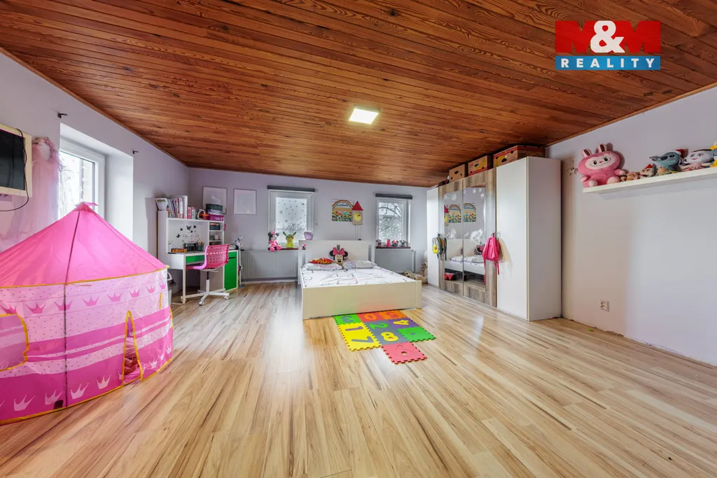 Obytná část domu má užitnou plochu cca 265 m² a poskytuje komfortní zázemí pro větší rodinu či vícegenerační bydlení. Dispozice domu nabízí dostatek prostoru a zároveň možnost úprav podle vlastních potřeb a představ nového majitele. Velkým benefitem je půdní prostor, který lze dokončit a vybudovat zde další plnohodnotné obytné podlaží, čímž se výrazně zvýší obytná plocha i celkový potenciál nemovitosti.