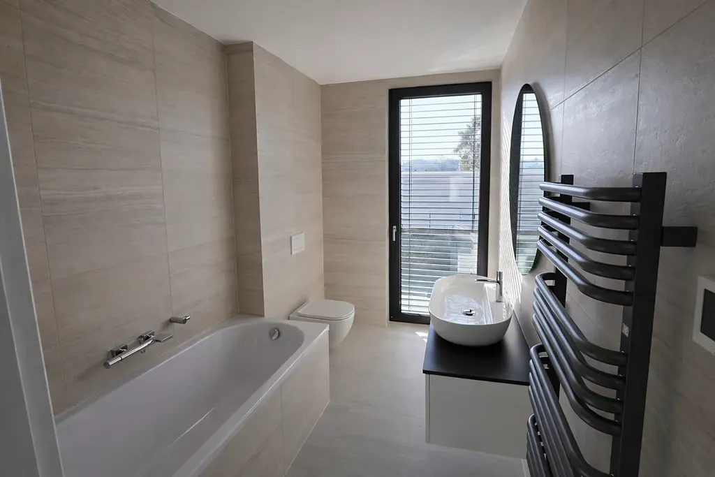 Vytápění je řešeno komfortním podlahovým topením pomocí infračervených topných rohoží. Ohřev vody zajišťuje bojler s integrovaným tepelným čerpadlem.