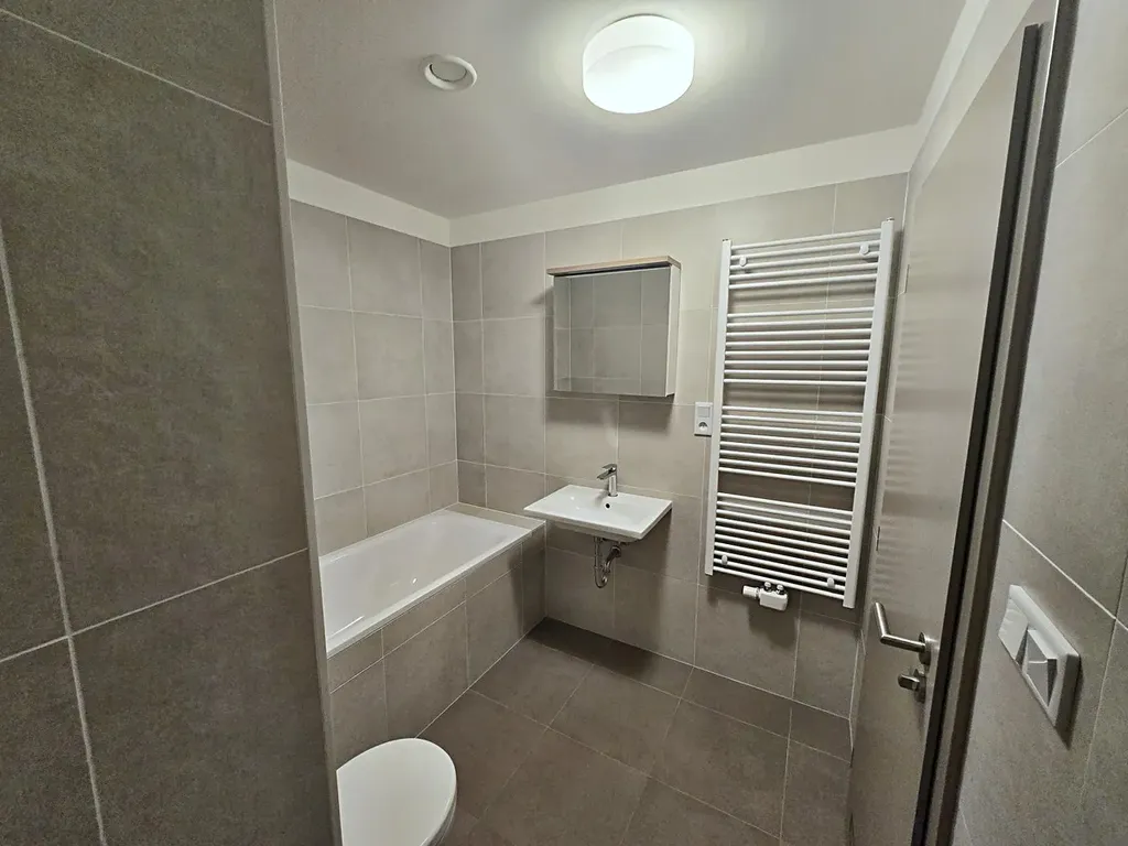 Koupelna je vybavena vanou, toaletou a skříňkou. V předsíni se nachází šatní skříň. Tento byt je ideální pro jednotlivce nebo páry, kteří ocení klidné bydlení v přírodě s dobrou dostupností do Prahy.