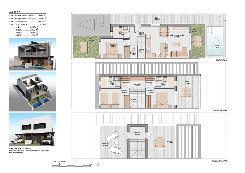 Každá vila je pečlivě rozvržena do dvou pater a navíc s střešním soláriem, které poskytuje prostorné místo pro moderní život. Nemovitosti zahrnují: