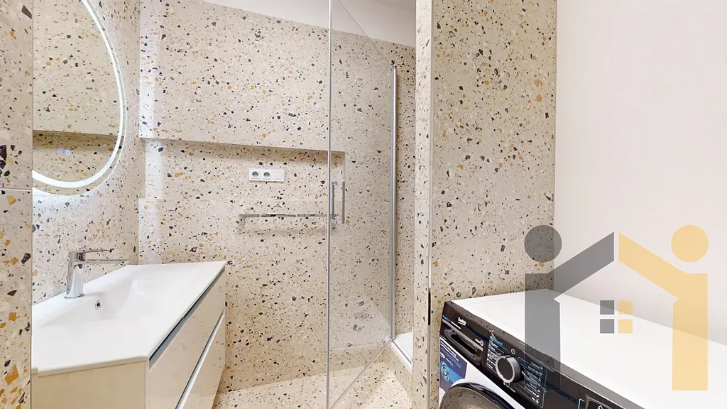 V rámci rekonstrukce bylo přidáno i dostatečné množství zásuvek, položeny nové podlahy v předsíni a kuchyni, koupelna i WC byly kompletně zrekonstruovány a osazeny designovými obklady a světly. V koupelně se nachází sprchový kout a majitelé pořídili budoucím nájemníkům i zcela novou pračku. Kuchyně je rovněž nová s novými vestavěnými spotřebiči a s novou samostatně stojící lednicí.