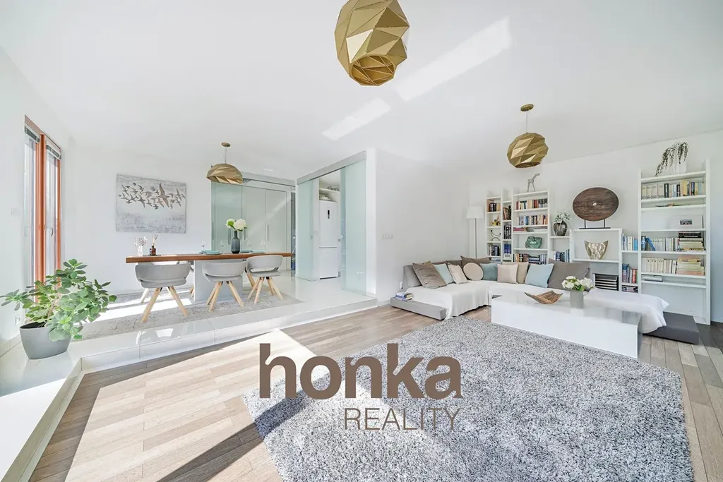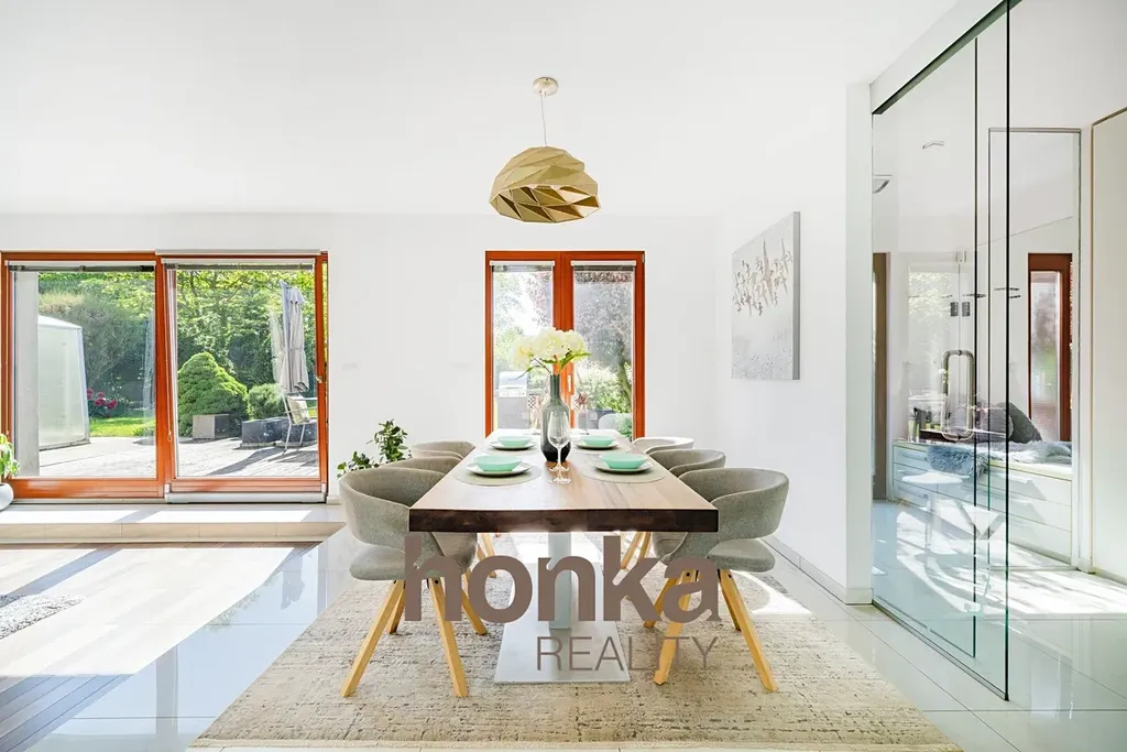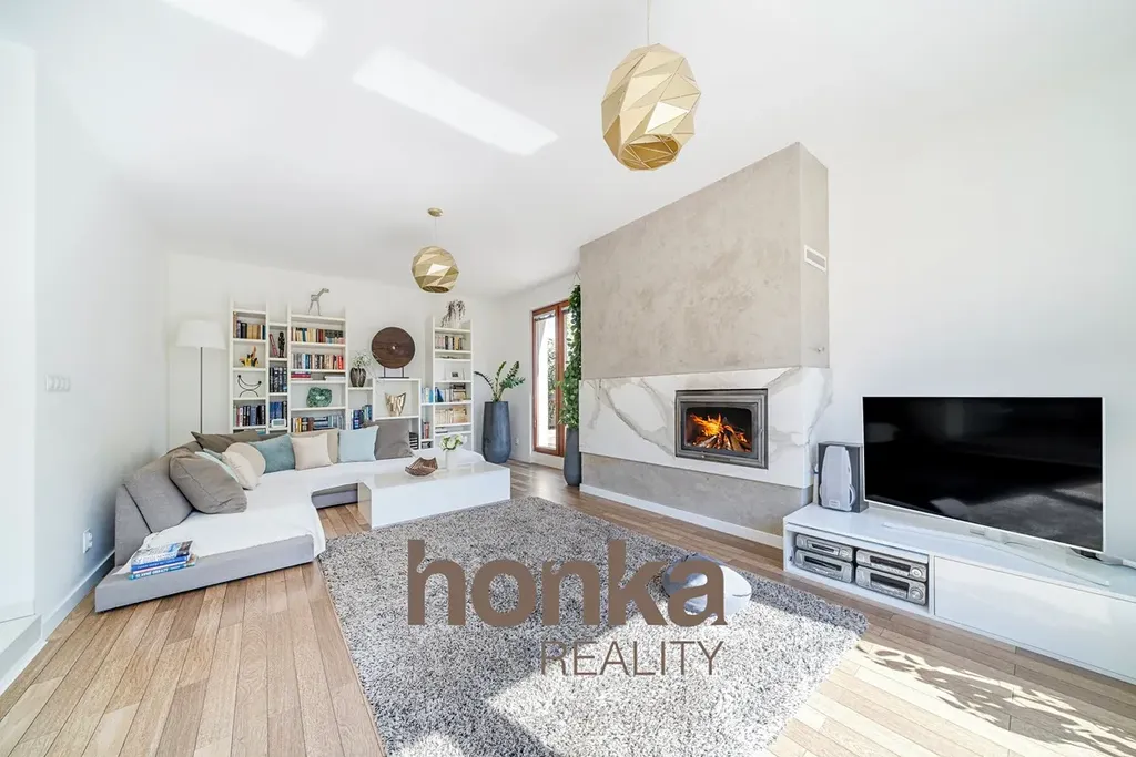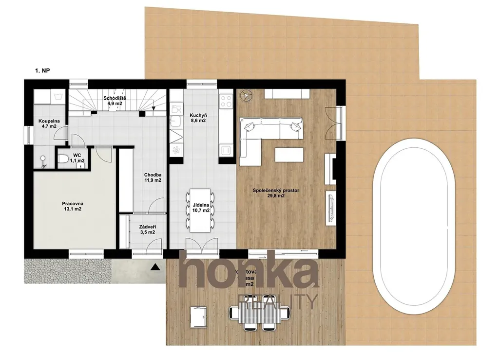 Přízemí: obývací pokoj (29,8 m²) se vstupem na terasu (30 m²), kuchyň, jídelna, pracovna, koupelna a samostatné WC