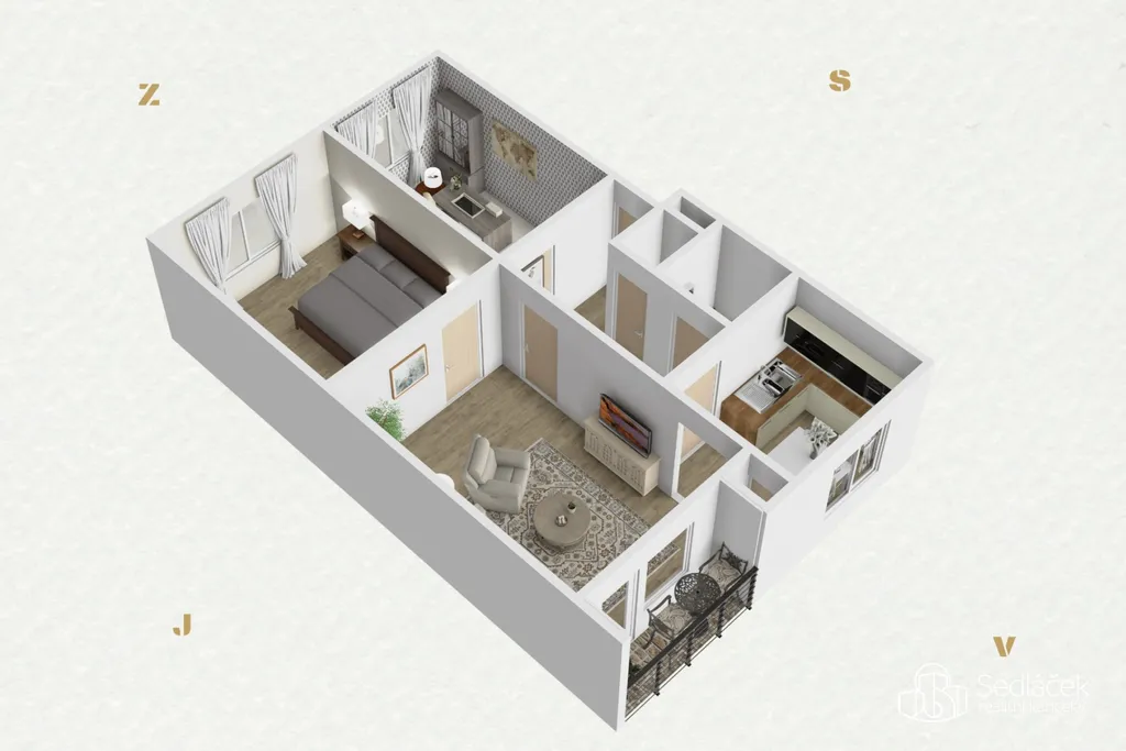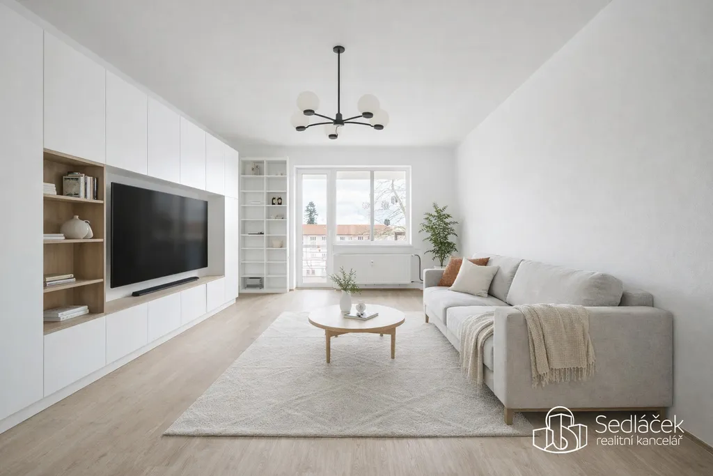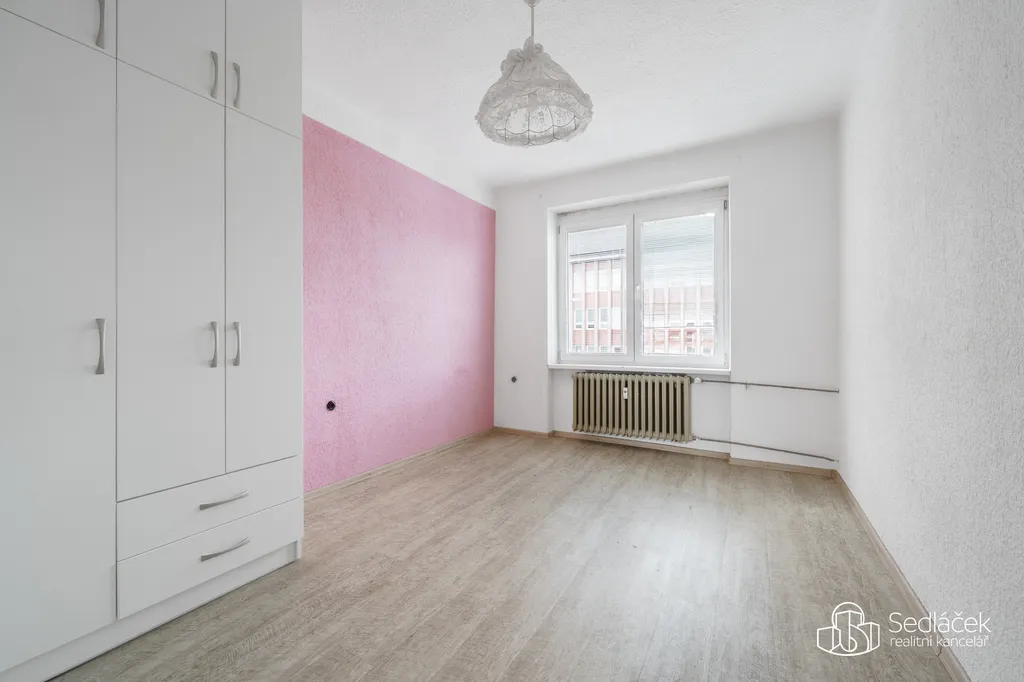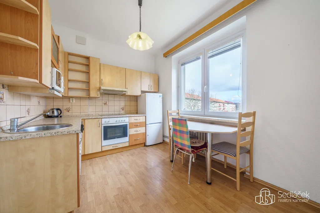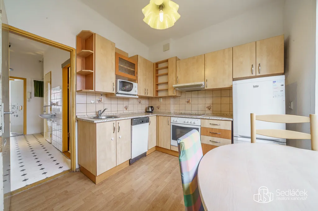 Dispozice bytu nabízí tři samostatné pokoje, a to dětský pokoj, ložnici a obývací pokoj se vstupem na balkon. Kuchyně je řešena jako samostatná místnost s dostatkem prostoru pro jídelní stůl. Na kuchyni navazuje praktická komora, která poskytuje další úložný prostor.
