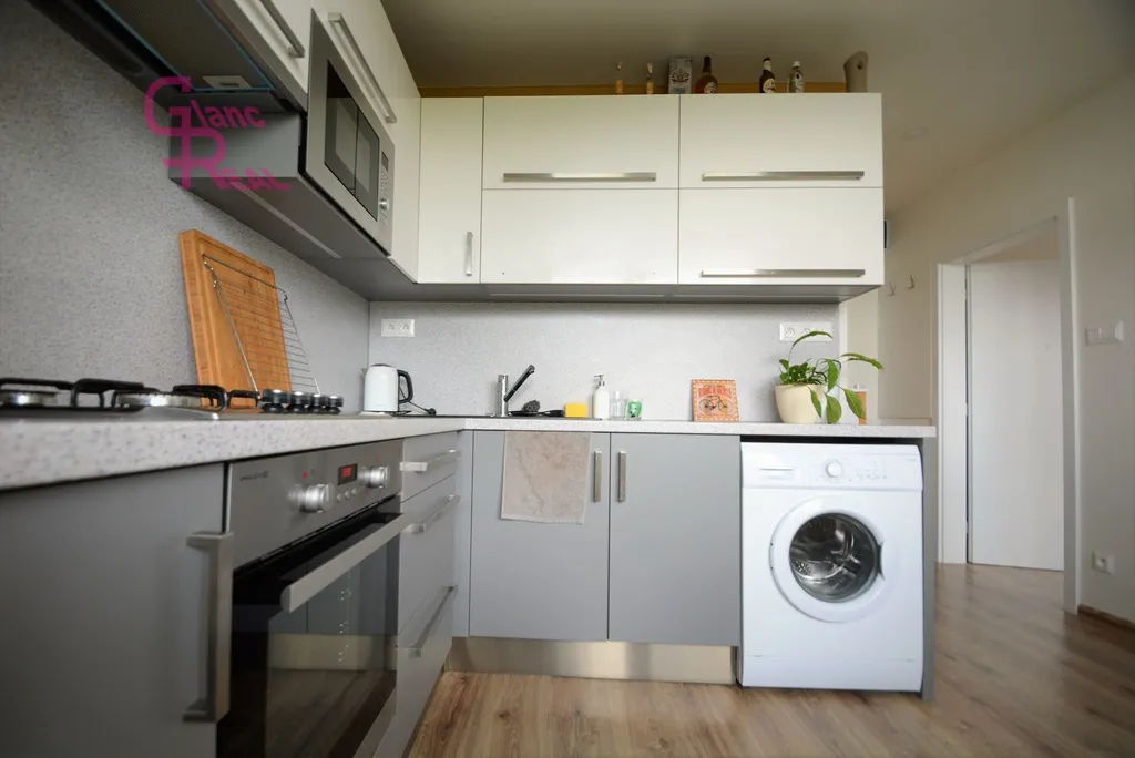 Byt je kompletně vybaven: v kuchyni rohová kuchyňská linka vč. spotřebičů (plynová varná deska, el.trouba, lednice, vestavěná mikrovlnná trouba, pračka, varná konvice), v pokoji: velké dvojlůžko, šatní skříň, sedačka, konferenční stolek, komoda, v předsíni botník, koupelna se sprchovým koutem, umyvadlo se skříňkou, zrcadlo. Z kuchyně je vstup na prostorný balkon cca 4 m2.