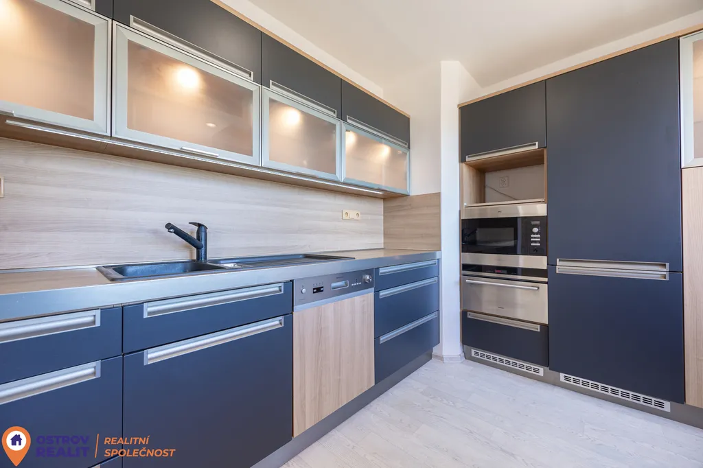 Srdcem bytu je moderně řešená kuchyňská linka s dostatkem pracovní plochy i úložného prostoru – ideální pro společné vaření i rodinné večeře. Praktická komora přímo v bytě navíc elegantně řeší úložné prostory.