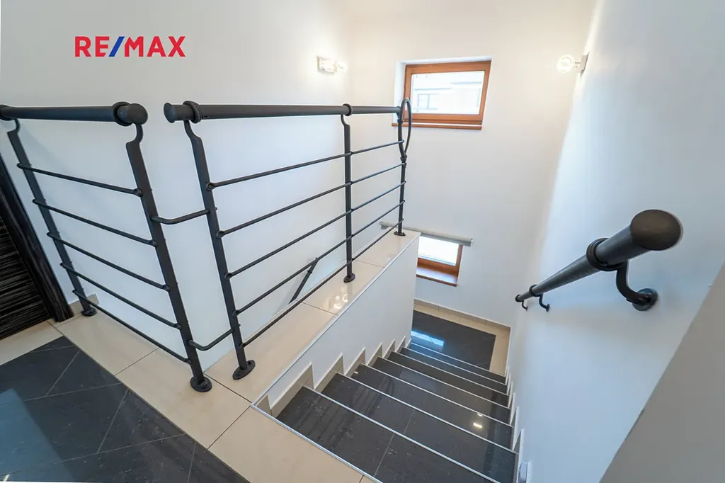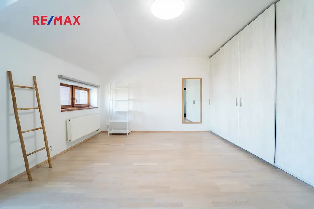 Do patra pak vedou pohodlné schody s podestou. V patře se nachází dva velkorysé dětské pokoje každý s výměrou 24 m2, ložnice s terasou a menší pokoj, který může sloužit jako pracovna či šatna. Koupelna je opět prostorná, je v ní umístěn nový plynový kondenzační kotel, který zajišťuje vytápění domu a ohřev vody.