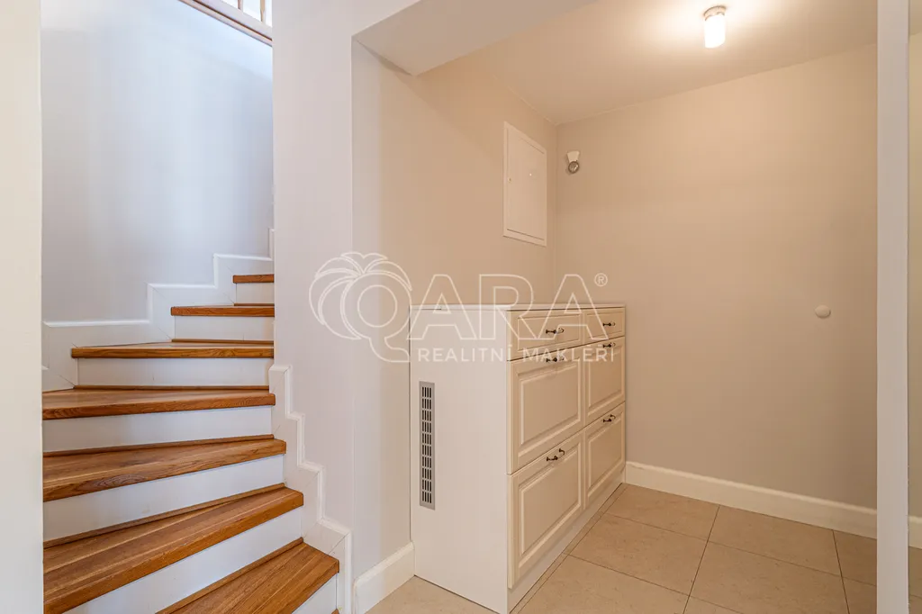 Horní úroveň (podkroví) slouží jako klidová zóna se dvěma ložnicemi a vlastní koupelnou. Ta je nadstandardně vybavena vanou, dvěma umyvadly, bidetem a toaletou, k dispozici je zde i pračka a sušička. Jedna z ložnic disponuje vlastní šatnou, druhá je klimatizovaná a nabízí přímý vstup na terasu (8,9 m²) s výhledem na Pražský hrad a střechy Starého Města. Byt má vlastní vytápění zajištěné plynovým kotlem. Na podlahách jsou dubové parkety.