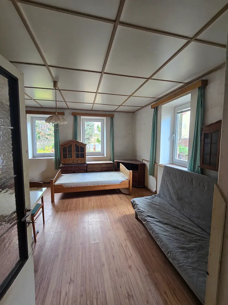 Hospodářské stavení v obci Hořovičky k prodeji. Okres Rakovník, pět minut od nového sjezdu dálnice D6. Dům je sestaven ze tří budov – budova obytná, bývalá sušička chmele, a velká garáž. V obytné budově jsou dva pokoje vč. kuchyně, modernizovaná koupelna, WC a velké podkroví. Garáž je opravená a prostorná, a sousedí s budovou bývalé sušičky chmele. To je velký prostor o dvou patrech, které lze použít jako skladovací prostory, stáje, nebo dílny. Ze strany dvora je do budovy sušárny vjezd velkými vraty, dále jsou součástí budovy bývalé zděné chlévy a sklepy. K budovám přiléhá i zahrada o výměře 985m2, která je nyní ovocným sadem. V obytné budově se topí tuhými palivy, okna jsou plastová. Nemovitosti jsou výjimečnou nabídkou pro všechny, kteří 30 min od Prahy po nové dálnici D6 chtějí budovat svůj sen o venkovské usedlosti, se sadem a třeba i zvířaty, včetně koní. Nemovitost je vhodná i jako smíšený areál pro bydlení a podnikání, kdy sušička chmele může sloužit i jako sklad, autodílna nebo stáje.