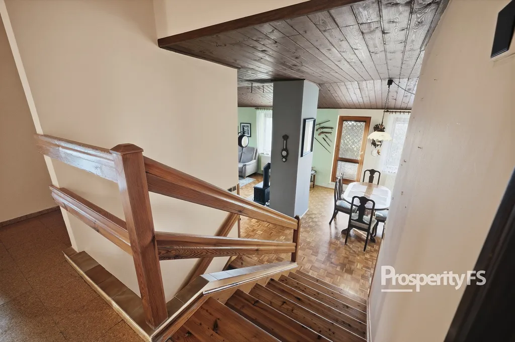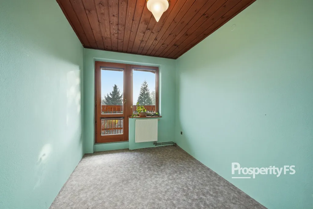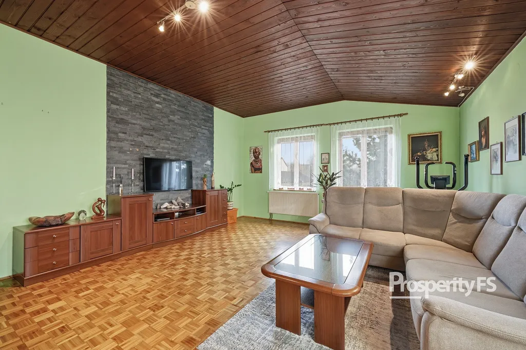 Prostorný obývací pokoj propojený s jídelnou (přes 30 m²), samostatná kuchyně s komorou, ložnice, dva další pokoje, koupelna a samostatné WC.