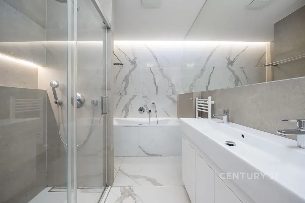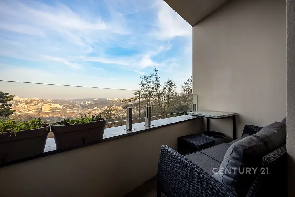 Samotný byt je proveden ve vysokém standardu s hliníkovými okny s izolačními trojskly, dřevěnými podlahami, velkoformátovými obklady a kvalitní sanitou. Velké prosklené plochy přirozeně propojují interiér s exteriérem a podtrhují vzdušnost a světelnost prostoru. Třešničkou na dortu je výhled na údolí Vltavy. Byt se pronajímá vybavený, součástí pronájmu je sklepní kóje a parkovací stání (zakladač) v podzemní garáži, které zajišťuje maximální komfort.