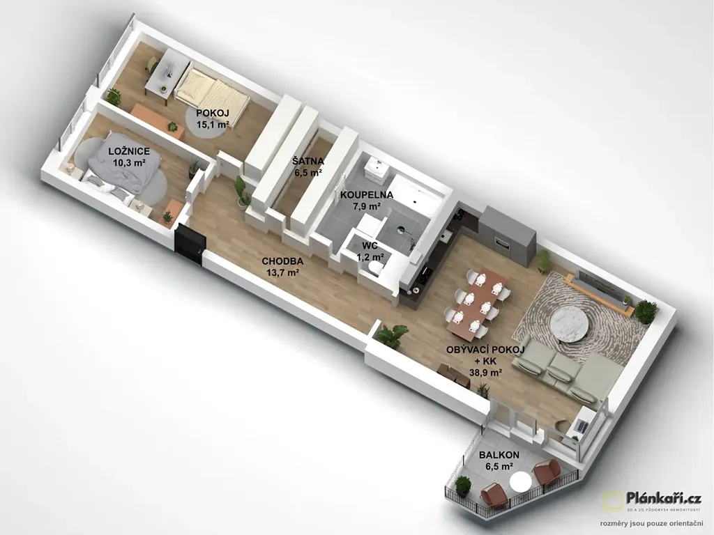 - 2x plnohodnotná ložnice (15,1 m2 + 10,3 m2)