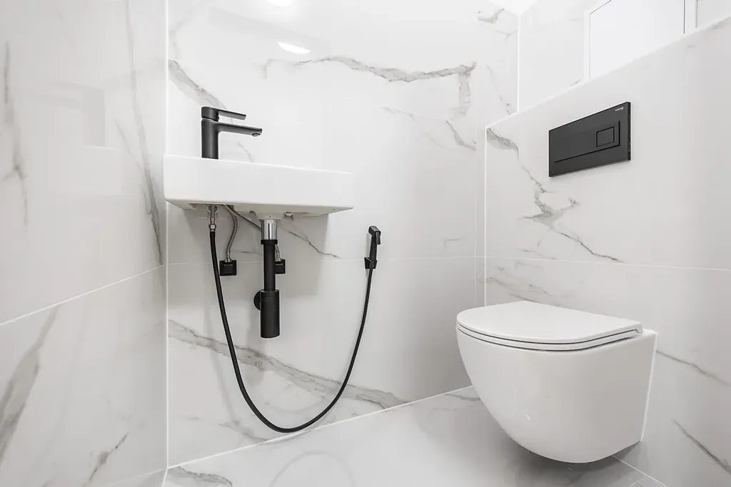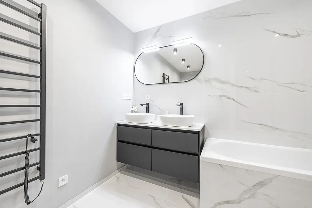- nová sanita (vana, sprcha, 3 umyvadla, 1x skříňka, toaleta)