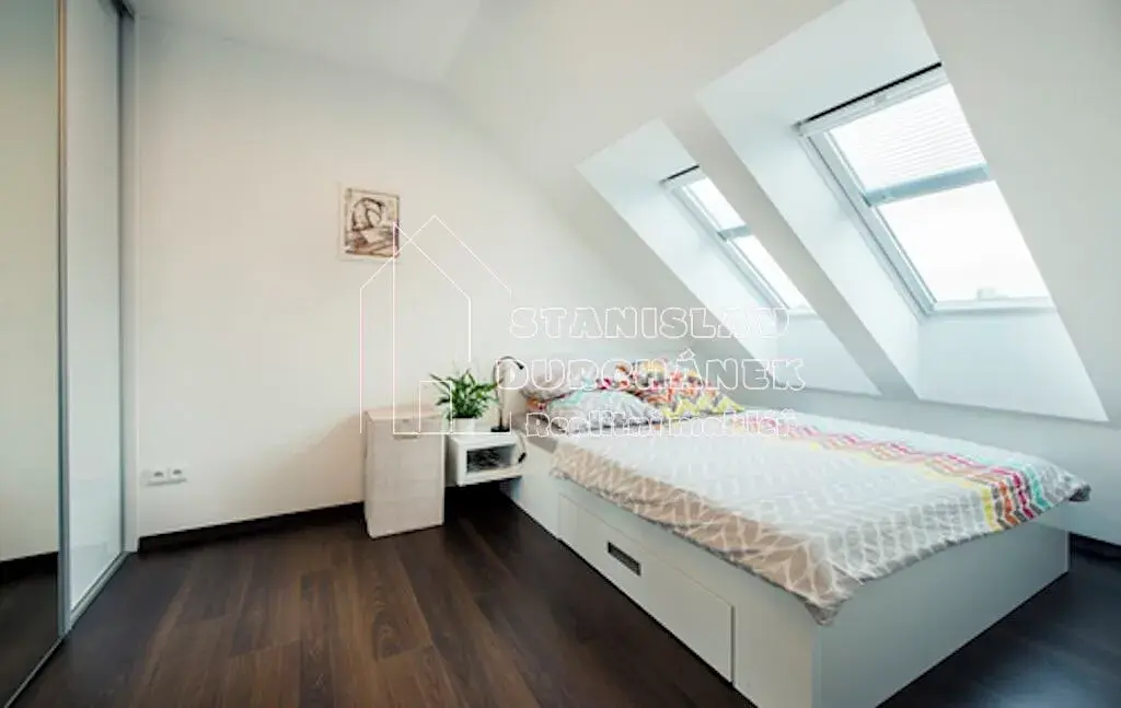 Byt bude pronajímán jako vybavený nábytkem i spotřebiči - viz foto: kuchyňská linka (lednička, mrazák, myčka, indukční varná deska, digestoř, pečící trouba, mikrovlnka), úložný prostor, stůl, dvojpostel. Koupelna je se sprchovým koutem a WC. Ke skladování je též k využití půdní prostor (19 m2) přístupný z bytu. V bytě je klimatizace.
