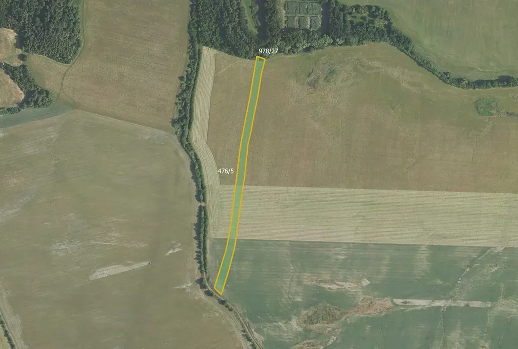 parc. č. 476/5 - orná půda o výměře 7 646 m², jejíž součástí je navazující část vodní plochy (parc. č. 978/27) o výměře 3 m²