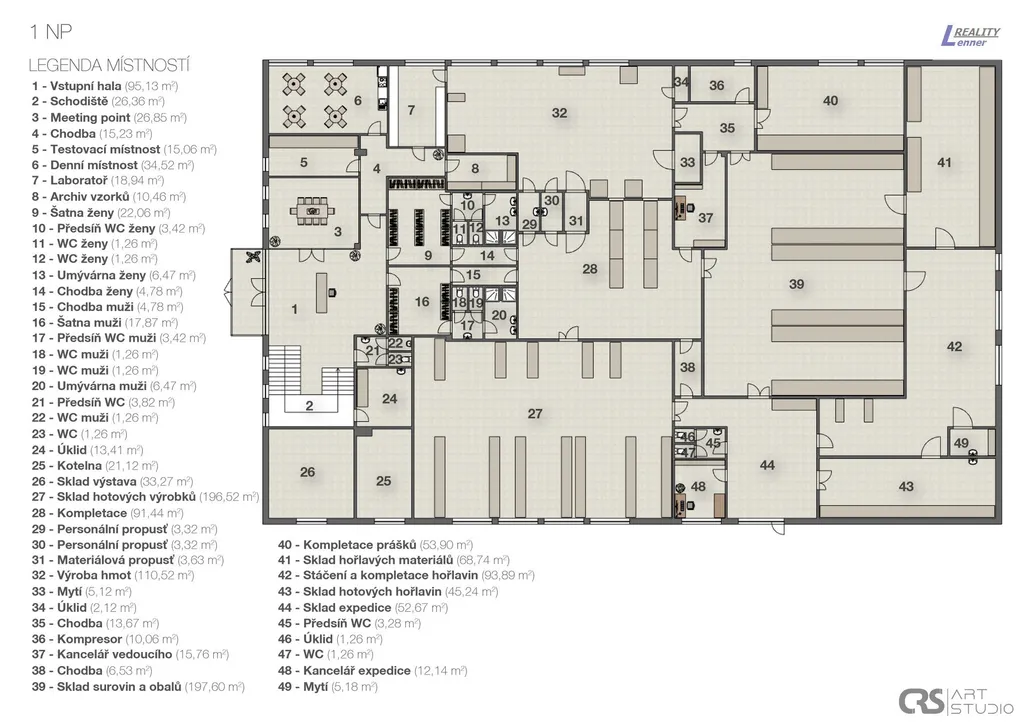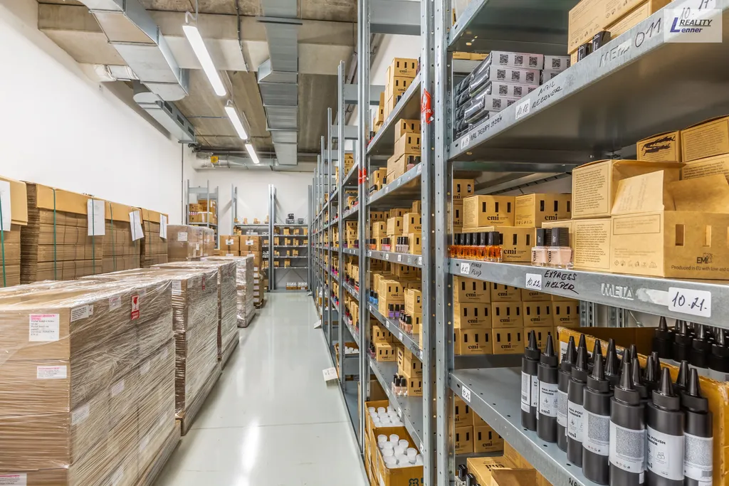 V přízemí areálu cca 1.500 m2 se nacházejí: sklad (hotových výrobků, surovin a obalu, hořlavých materiálů, hořlavých surovin, prostor pro plnění hořlavých materiálu, prostor pro plnění kosmetických přípravků, laboratoř - prostor pro plnění a balení, prostor pro expedici a příjem zboží, jídelna pro zaměstnance, pánské a dámské šatny, sklad inventáře, technické místnosti atd.).