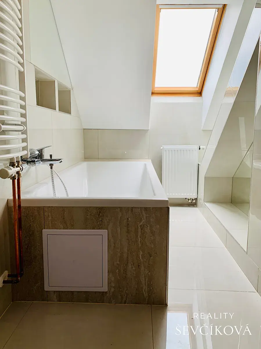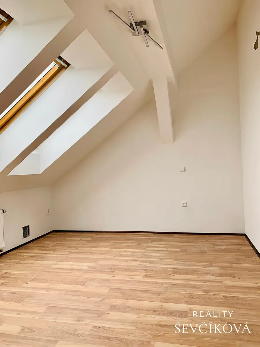 Dispozice: obývací pokoj s kuchyňskou linkou, ložnice, koupelna s vanou a WC a další dva otevřené pokoje umístěné v patře (vhodné jako pracovna nebo šatna).