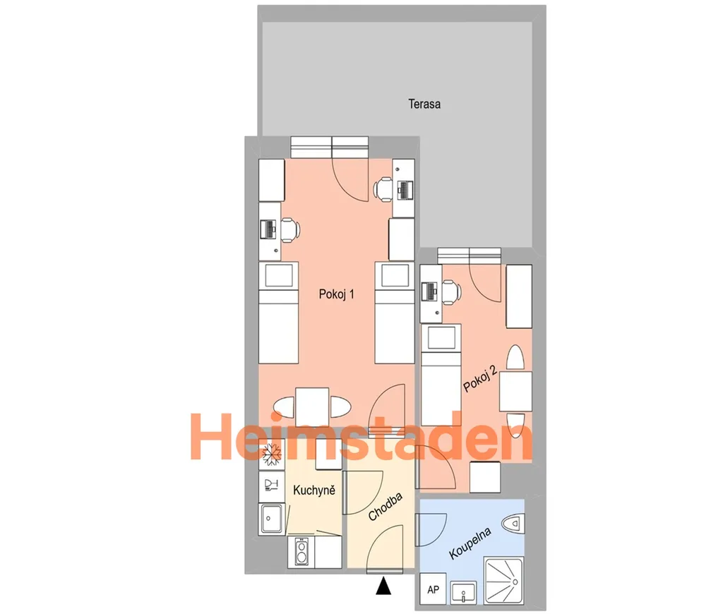 Dispozice bytu tvoří dva samostatné, neprůchozí pokoje. Větší pokoj je vybaven dvěma jednolůžkovými postelemi, menší pokoj jednou jednolůžkovou postelí, což umožňuje pohodlné bydlení až pro tři osoby. Samostatná kuchyně je plně zařízená a připravená k okamžitému užívání. Výraznou předností bytu je velká terasa, která poskytuje příjemné místo k odpočinku, posezení nebo studiu na čerstvém vzduchu.