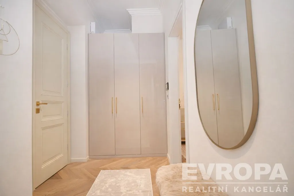 Nabízíme k pronájmu elegantní a kompletně zařízený apartmán o dispozici 2+kk a celkové ploše 39,6 m², situovaný v reprezentativním historickém domě Clock Palace v ulici U Zvonařky na prestižních Vinohradech (Praha 2).