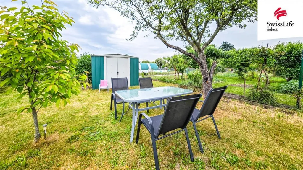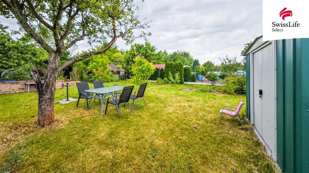 Na pozemku je k dispozici plechový domek pro uložení sekačky na trávu a dalších zahradních potřeb. Velkou výhodou je přívod užitkové vody přímo na pozemek. V zahrádkářské kolonii se nachází zdroj pitné vody, ze kterého je možné vodu odebírat.