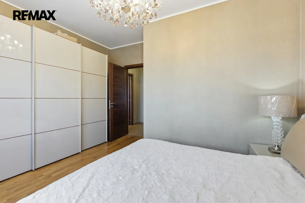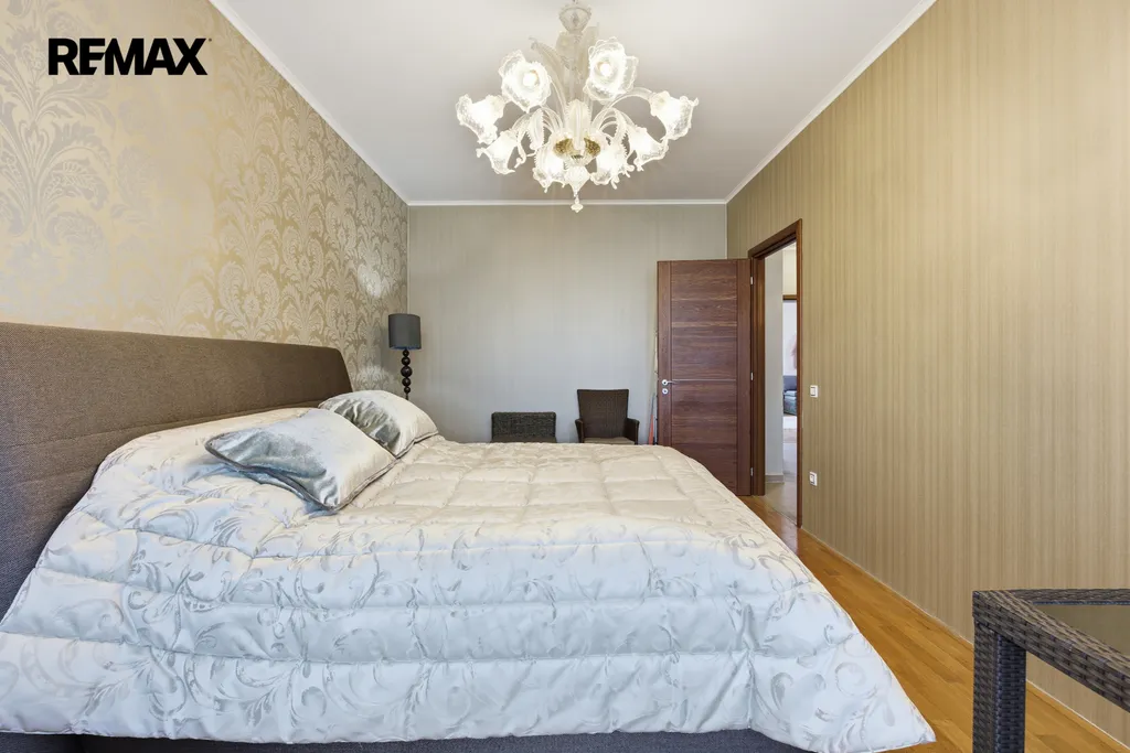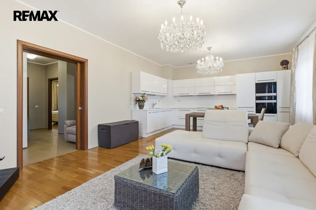 Byt je kompletně vybaven a připraven k okamžitému nastěhování. Interiéru dominují masivní interiérové dveře, kvalitní dřevěné parkety a elegantní křišťálové lustry, které dodávají prostoru nádech luxusu. Kuchyň je vybavena moderními spotřebiči, včetně nové myčky nádobí a nové trouby.
