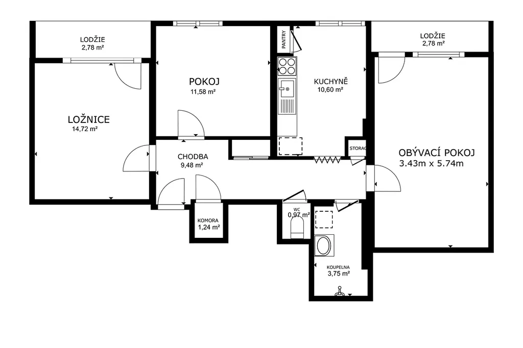 Byt o dispozici 3+1 o velikosti 72,85 m², ke kterému náleží dvě lodžie 5,56 m² (2x 2,78m² + 2,78 m²), sklep 5,4 m² (do kterého je přivedená elektřina z bytu) a kotelna 4,1 m² s vlastním plynovým kotlem. Celková plocha bytu tak činí 87,91 m².