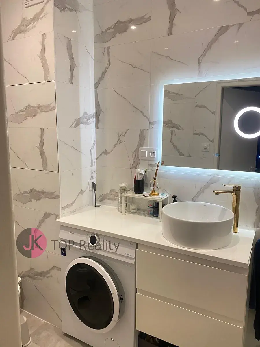Byt se nabízí zařízený – nová kuchyňská linka (sklokeramická deska, vestavěná el. trouba, myčka na nádobí, lednice s mrazákem, volně stojící mikrovlnná trouba, varná konvice a toastovač), jídelní stůl se 2 židlemi, v pokoji šatní skříň, dvoulůžko, sofa s taburetem, konferenční stolek, lampy, komoda, TV. Koupelna je vybavena sprchovým koutem, WC, novou pračkou, dále je zde zrcadlo a koupelnová skříňka. V předsíni zrcadlo.