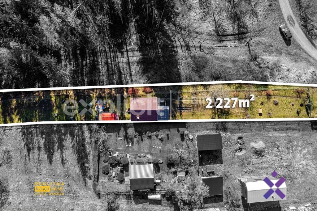 Celková plocha pozemku je 2.227 m² a má tvar úzkého, dlouhého pásu o šíři cca 9 až 19,5 metru a délce přibližně 168 metrů. Pozemek je oplocený, přístupný po obecní zpevněné komunikaci a u stavby je možnost parkování. Tento prostor nabízí spoustu možností pro relaxaci, zahradu nebo další rekreační využití.