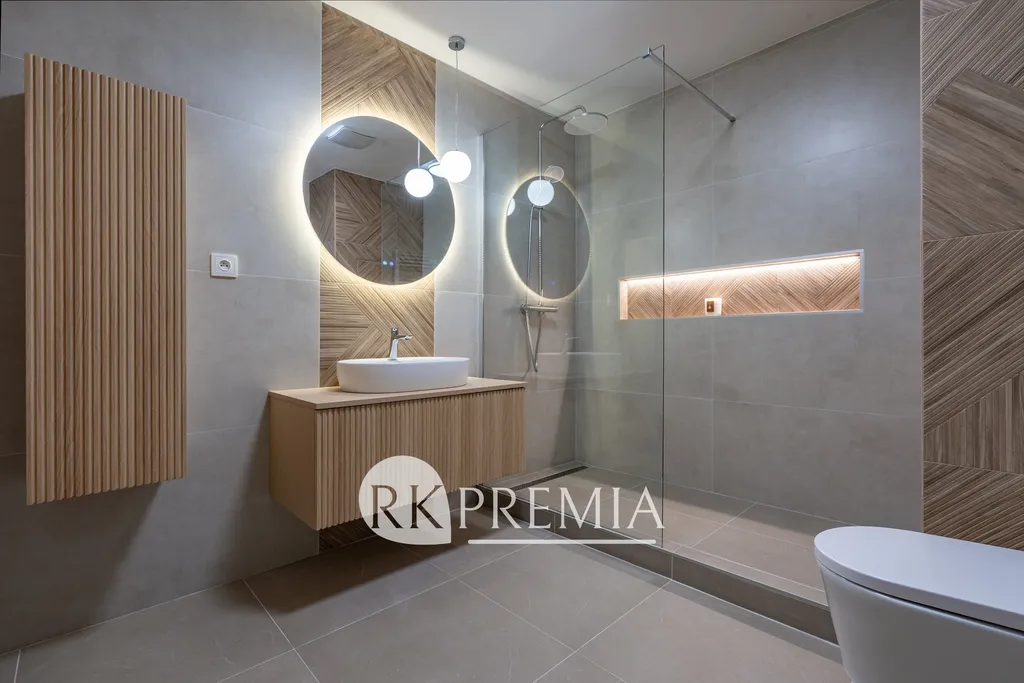Koupelna? Nadstandardně prostorná. Sprchový kout, závěsné WC, designová skříňka s umyvadlem a zrcadlo s dotykovým ovládáním světla i funkcí odmlžení. Osvětlení v celém bytě umožňuje regulaci teploty světla – náladu si tak nastavíte podle sebe. Ráno svěží energie, večer tlumený klid.