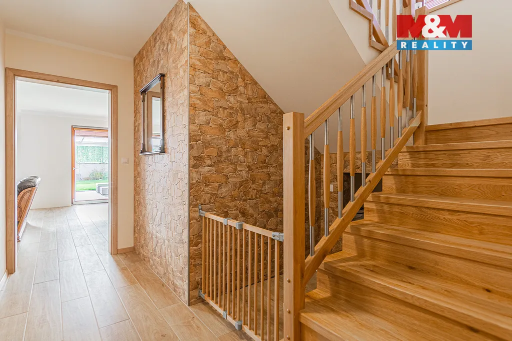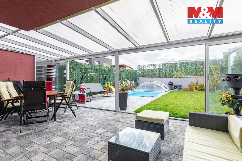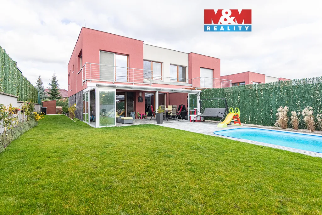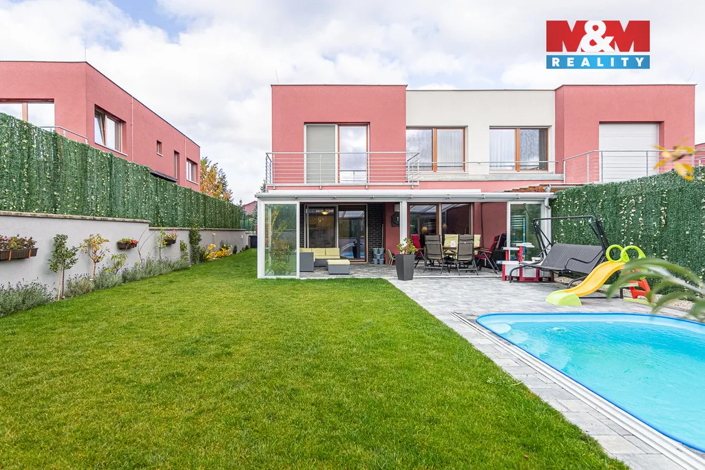 Dům je proveden v nadstandardním standardu – venkovní žaluzie, kvalitní podlahy, sádrové omítky, alarm, plynový kotel, garáž na dálkové ovládání. Zahrada nabízí bazén se slanou vodou a protiproudem, pergolu a automatickou závlahu. Jedinečná nabídka komfortního a klidného bydlení u Prahy.