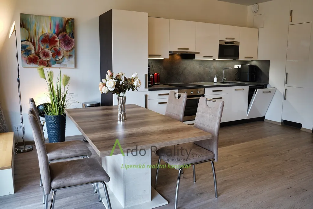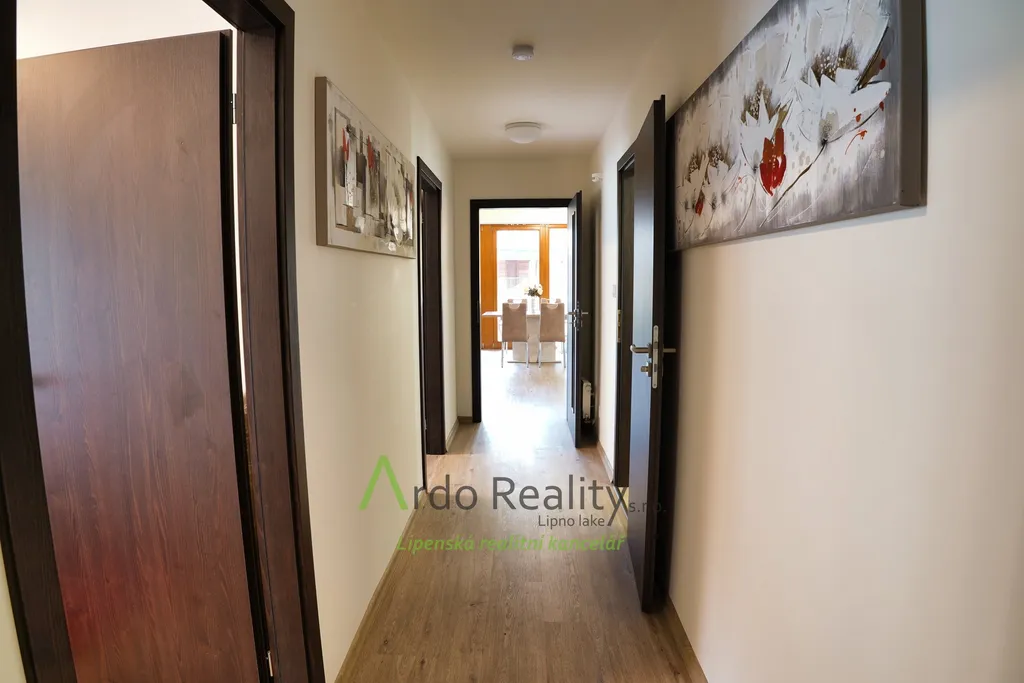 Nabízíme Vám jedinečný byt 3+kk v krásné lokalitě Lipna nad Vltavou. Tento prostorný a moderní byt o užitné ploše 97 m² se nachází v cihlové budově na 1. nadzemním podlaží a je bezbariérový. K dispozici je také terasa o velikosti 10 m², která je ideální pro relaxaci a odpočinek. Byt je plně zařízený a nabízí veškerý komfort pro pohodlné bydlení. Jsou zde dvě koupelny a prostorná sauna. Součástí nabídky je také garáž o rozměrech 22 m². Ve dvou místnostech je klimatizace, kterou lze také topit. Z ložnice je pěkný výhled na jezero, které je vzdáleno jen asi 70 metrů. Dům stojí na pěkném místě. Investor v okolí zanechal pěkné stromy a nedaleko je pěkný remízek. V bytě je tedy dostatečný klid. K této a okolím nemovitostem vede soukromá příjezdová komunikace. Lipno nad Vltavou nabízí bohaté možnosti pro volnočasové aktivity a sportovní vyžití. Tento byt je skvělou investicí pro ty, kteří hledají moderní a komfortní bydlení nebo příležitost k investici v jednom z nejkrásnějších míst v České republice. K nejbližší restauraci asi 400 metrů, na veřejnou udržovanou pláž asi 450 metrů, skiareál Lipno je vzdálen 1 km a například Aquapark 800 metrů. Stezka korunami stromů je pěšky vzdálena jen 2,7 km. Lázeňský městys Frymburk je vzdálen 8,6 km. Tyto domy se nachází pod hlavní komunikací číslo 163 a tedy například jen 200 metrů vzdušnou čarou od přístavu. Neváhejte nás kontaktovat a rezervovat si prohlídku!