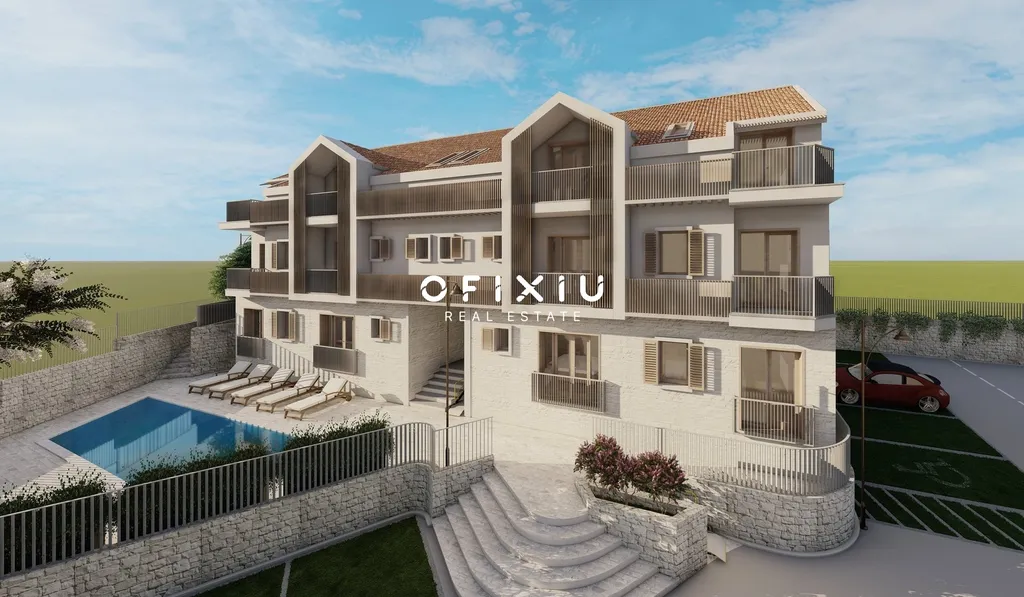Rezidence Rhizon Trinity kombinuje moderní architekturu s tradičními prvky typickými pro oblast Boky Kotorské. Kamenné obklady, dřevěné detaily na fasádách a čisté linie vytvářejí harmonický celek, který citlivě zapadá do přírodního prostředí.